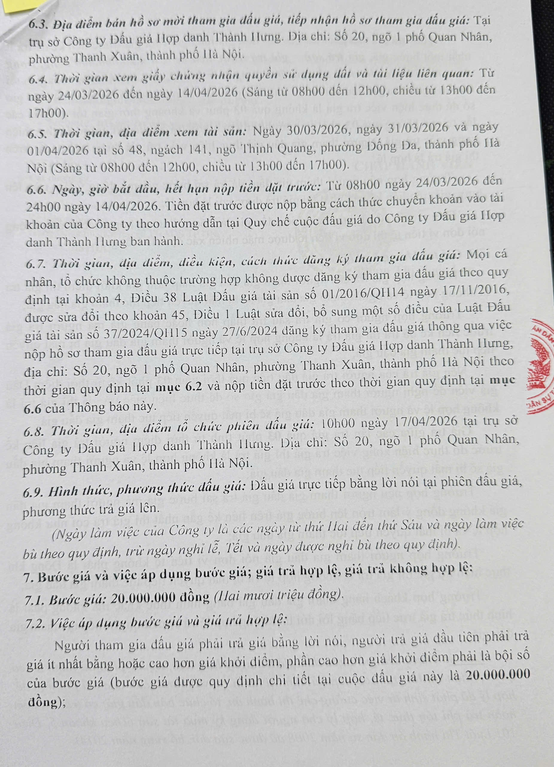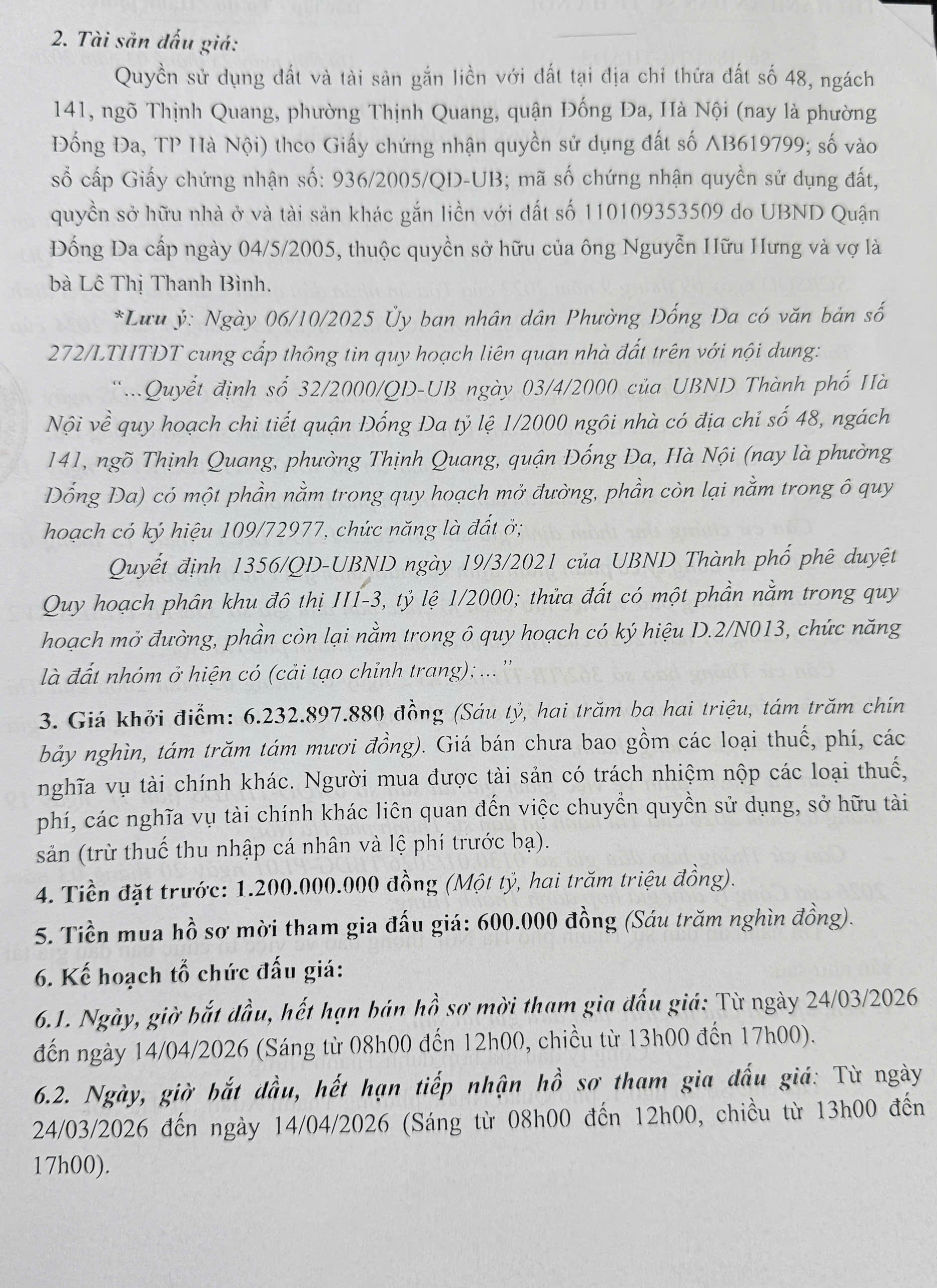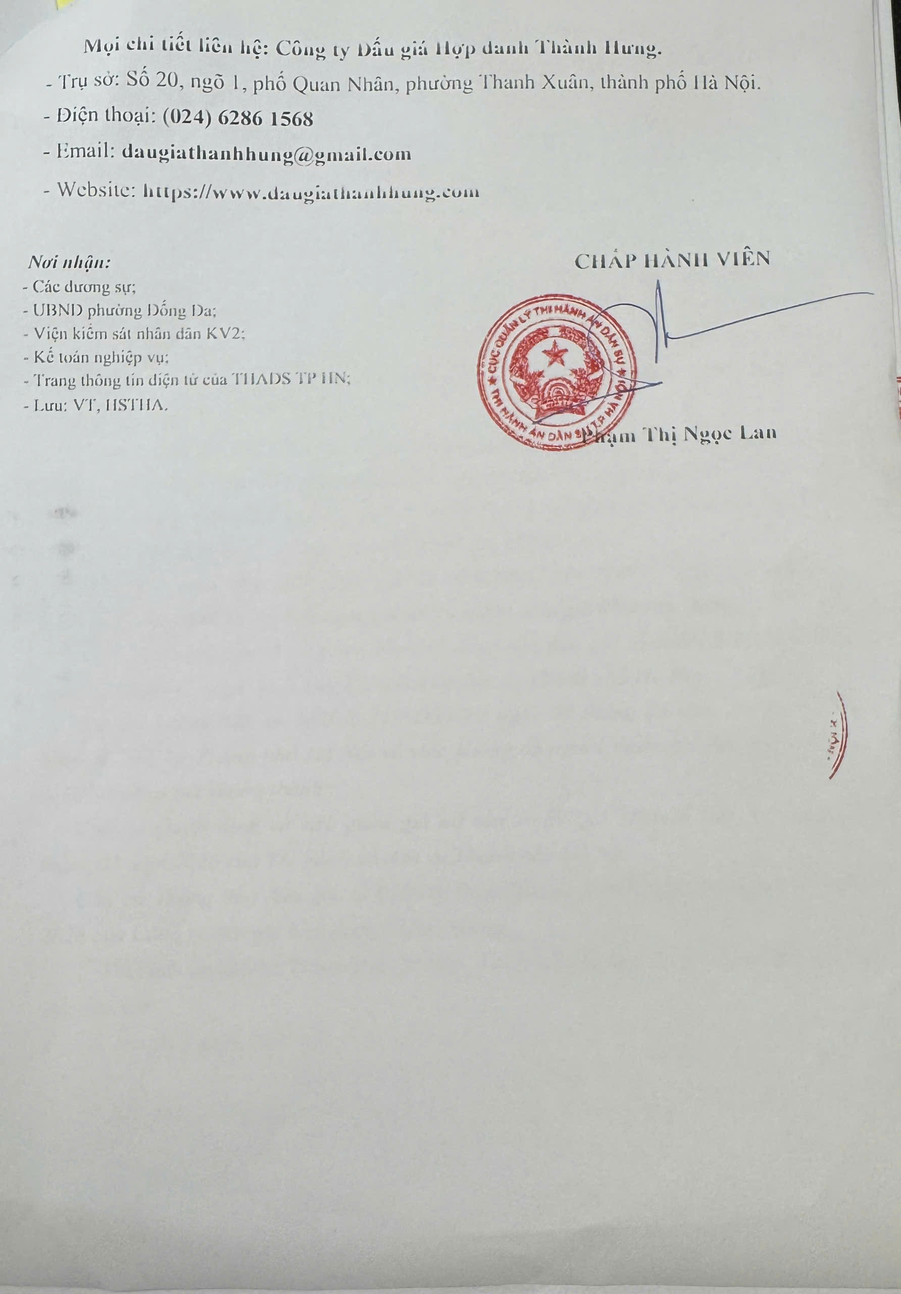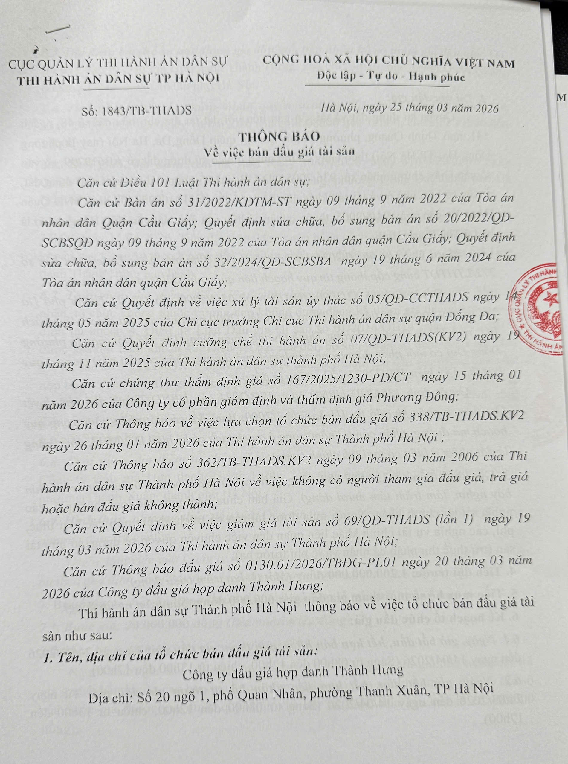Phòng thi hành án dân sự khu vực 2-Hà Nội thông báo về việc bán đấu giá tài sản số 1843/TB-THADS ngày 25/03/2026