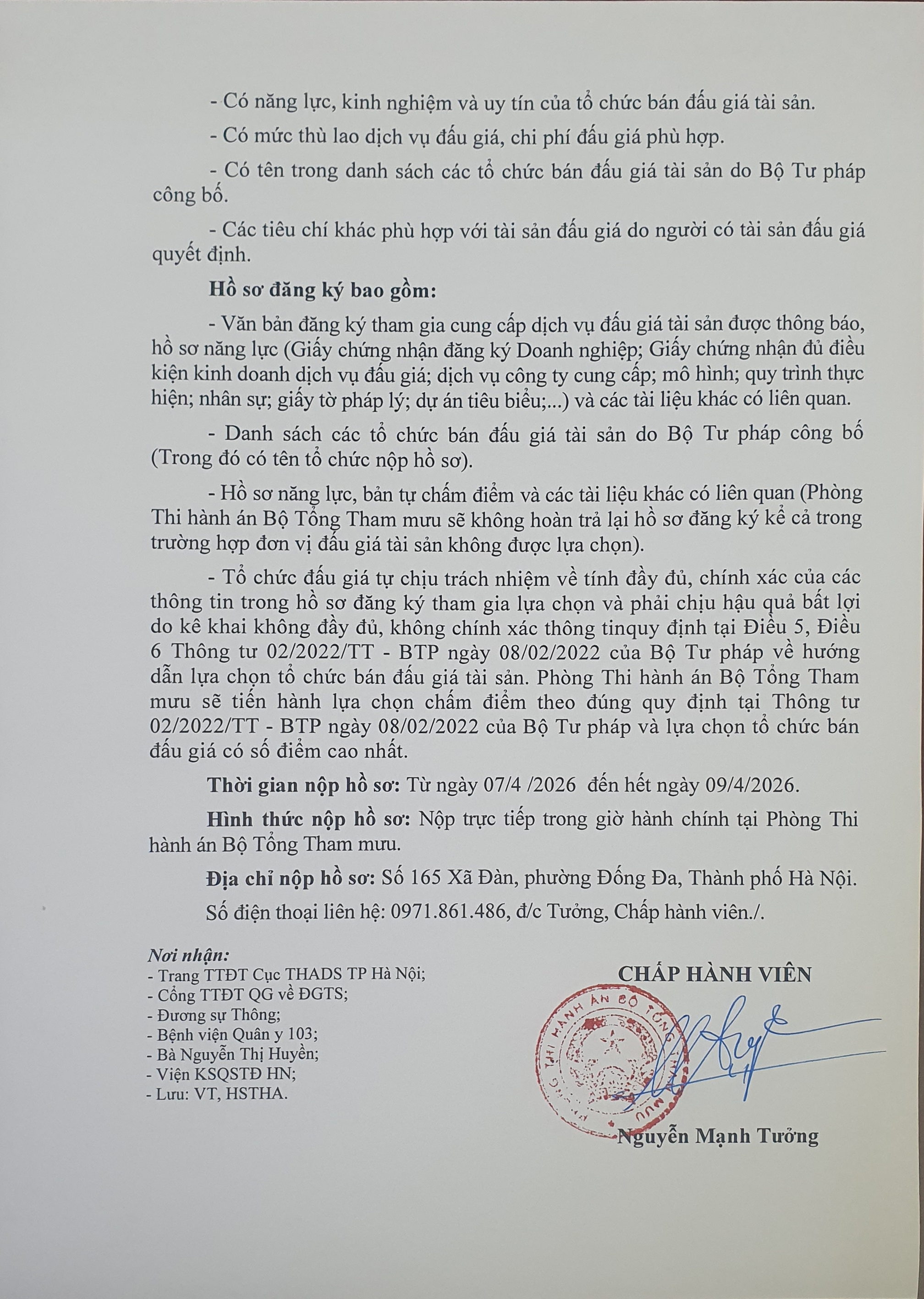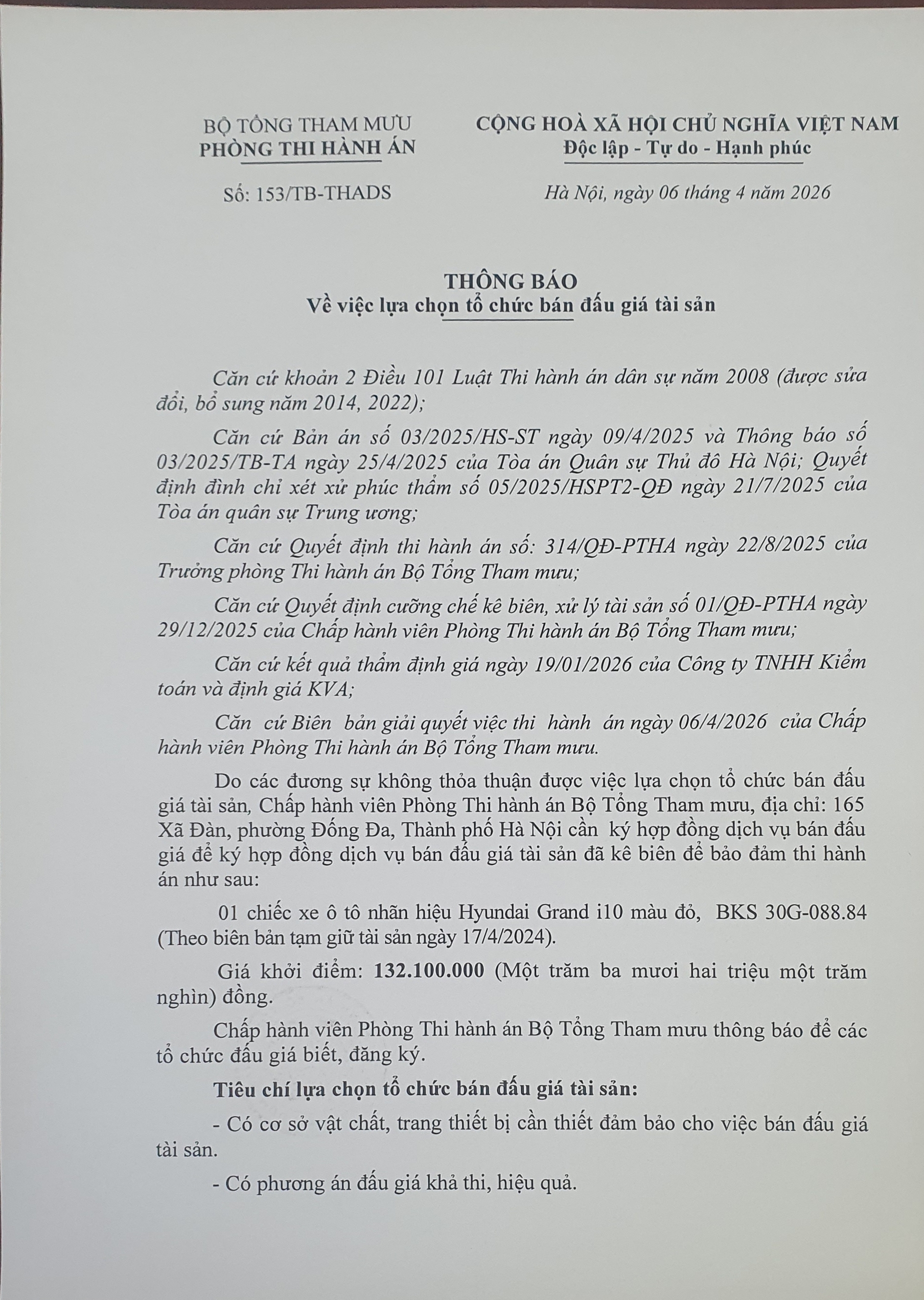 Phòng Thi hành án Bộ Tổng tham mưu thông báo số 153/TB-THADS về việc lựa chọn tổ chức bán đấu giá tài sản