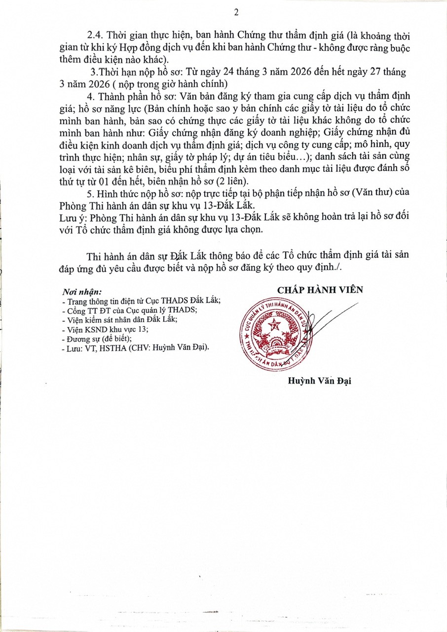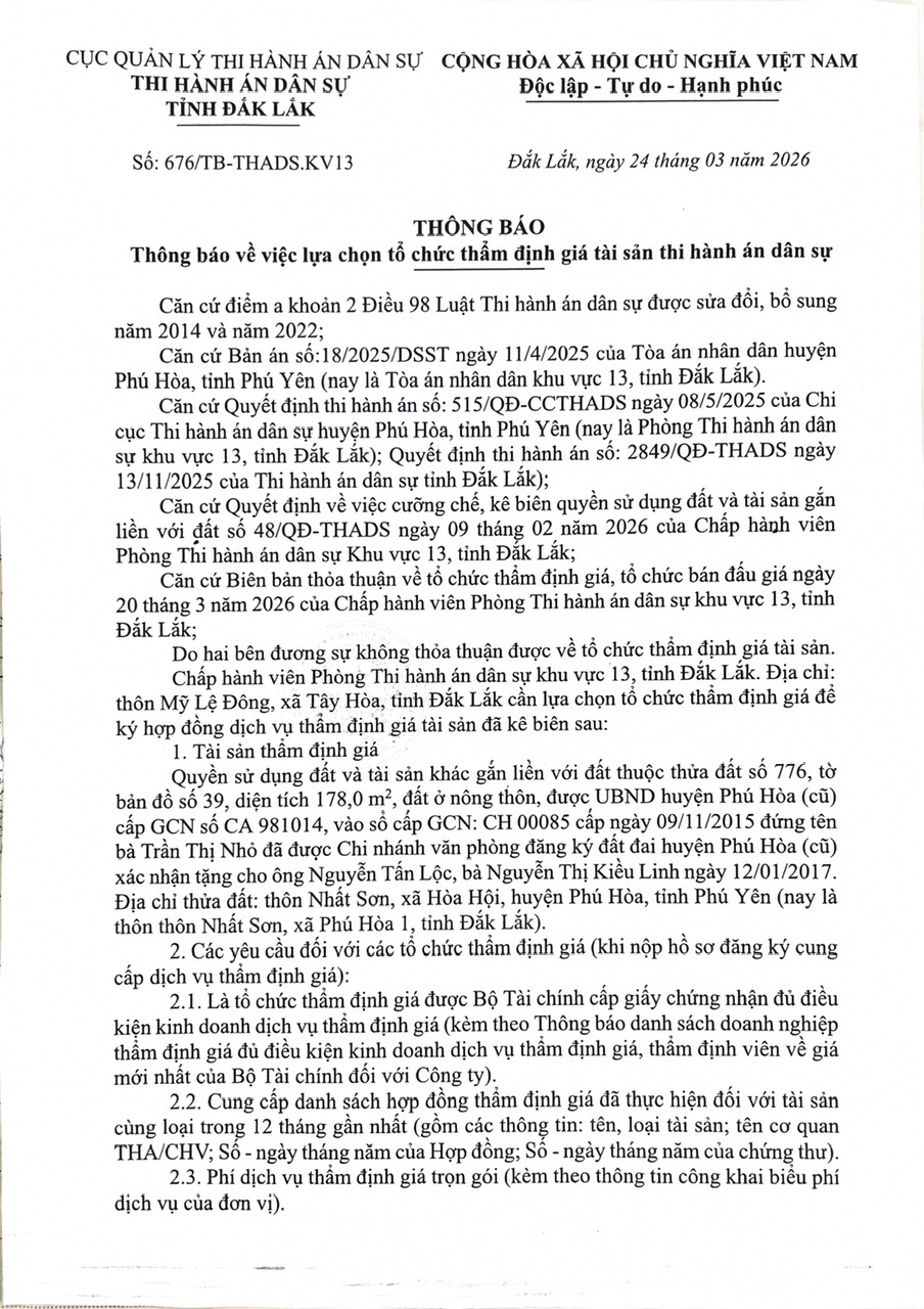 Phòng THADS Khu vực 13 - Đắk Lắk thông báo số 676/TB-THADS.KV13 ngày 24/3/2026 về việc lựa chọn tổ chức thẩm định giá