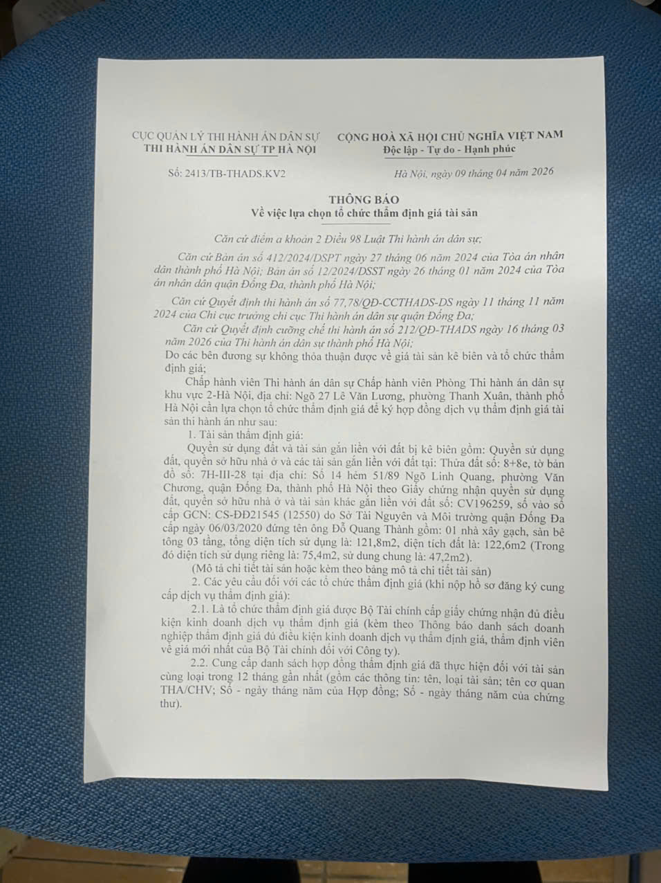 Phòng Thi hành án dân sự Khu vực 2-Hà Nội Thông báo về việc lựa chọn tổ chức thẩm định giá tài sản số 2413/TB-THADS.KV2413