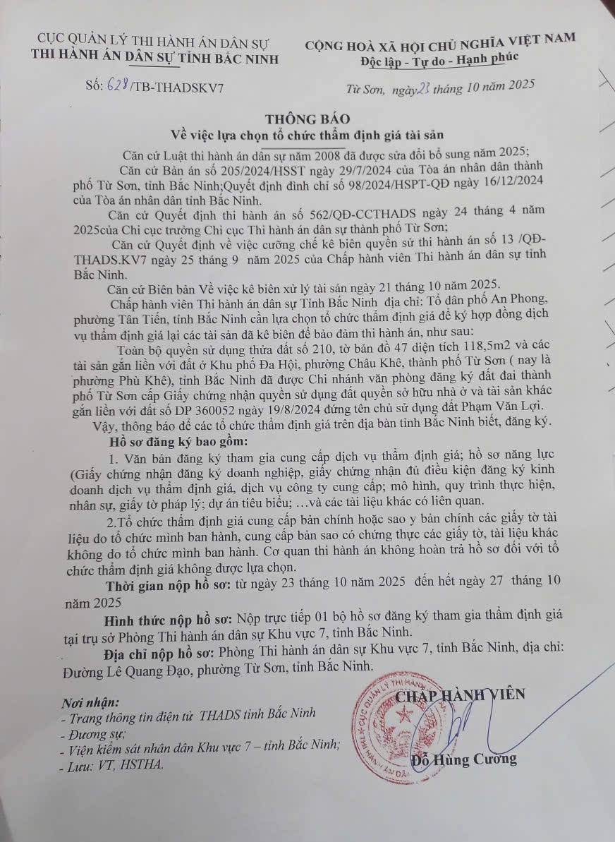CHV Đỗ Hùng Cường Phòng Thi hành án dân sự khu vực 7 - Bắc Ninh Thông báo về việc lựa chọn tổ chức thẩm định giá tài sản số 628/TB-THADS.KV7 ngày 23/10/2025