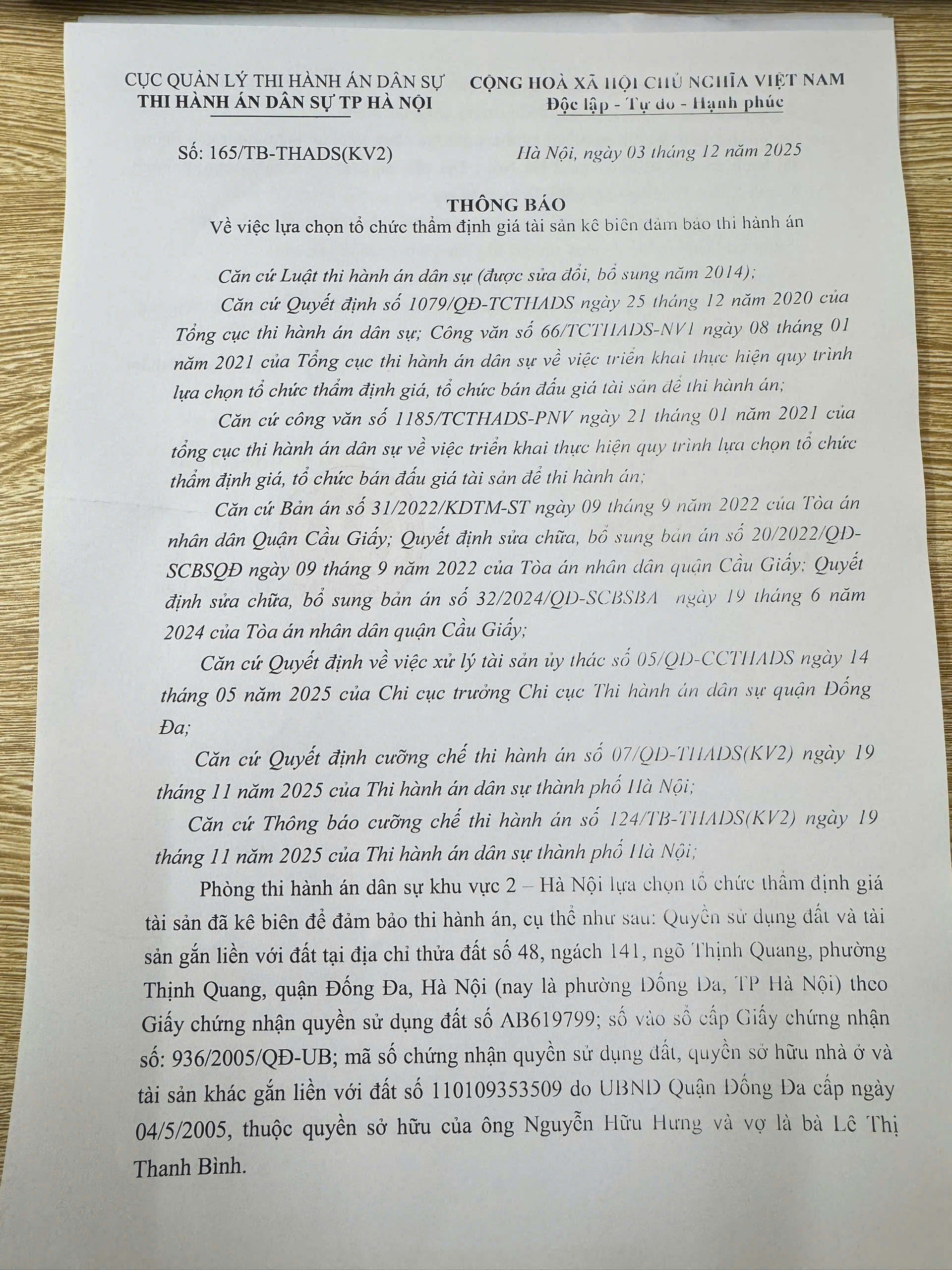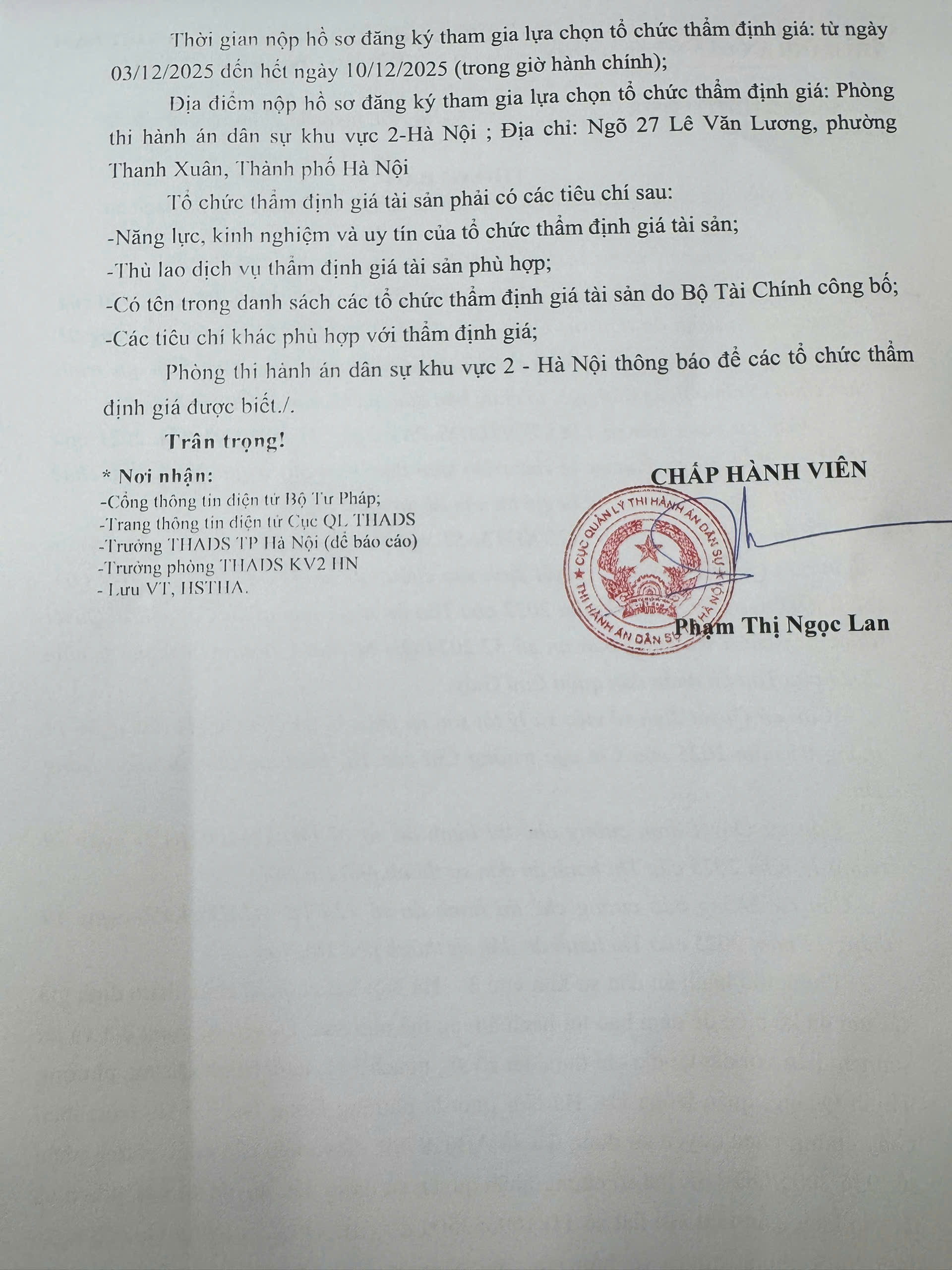 Phòng thi hành án dân sự khu vực 2 - HN thông báo số 165/TB-THADS ngày 03/12/2025 về việc lựa chọn tổ chức thẩm định giá TS