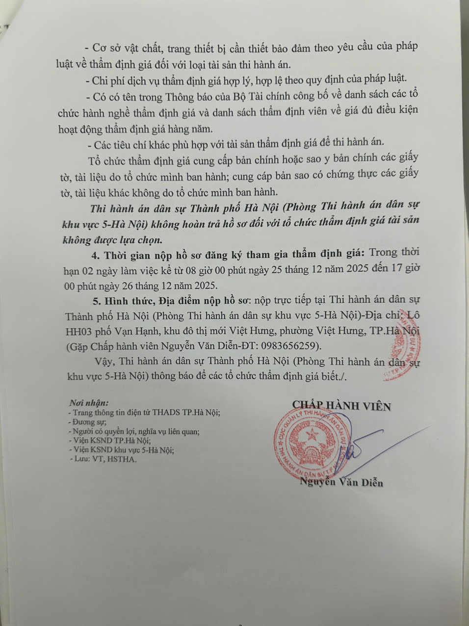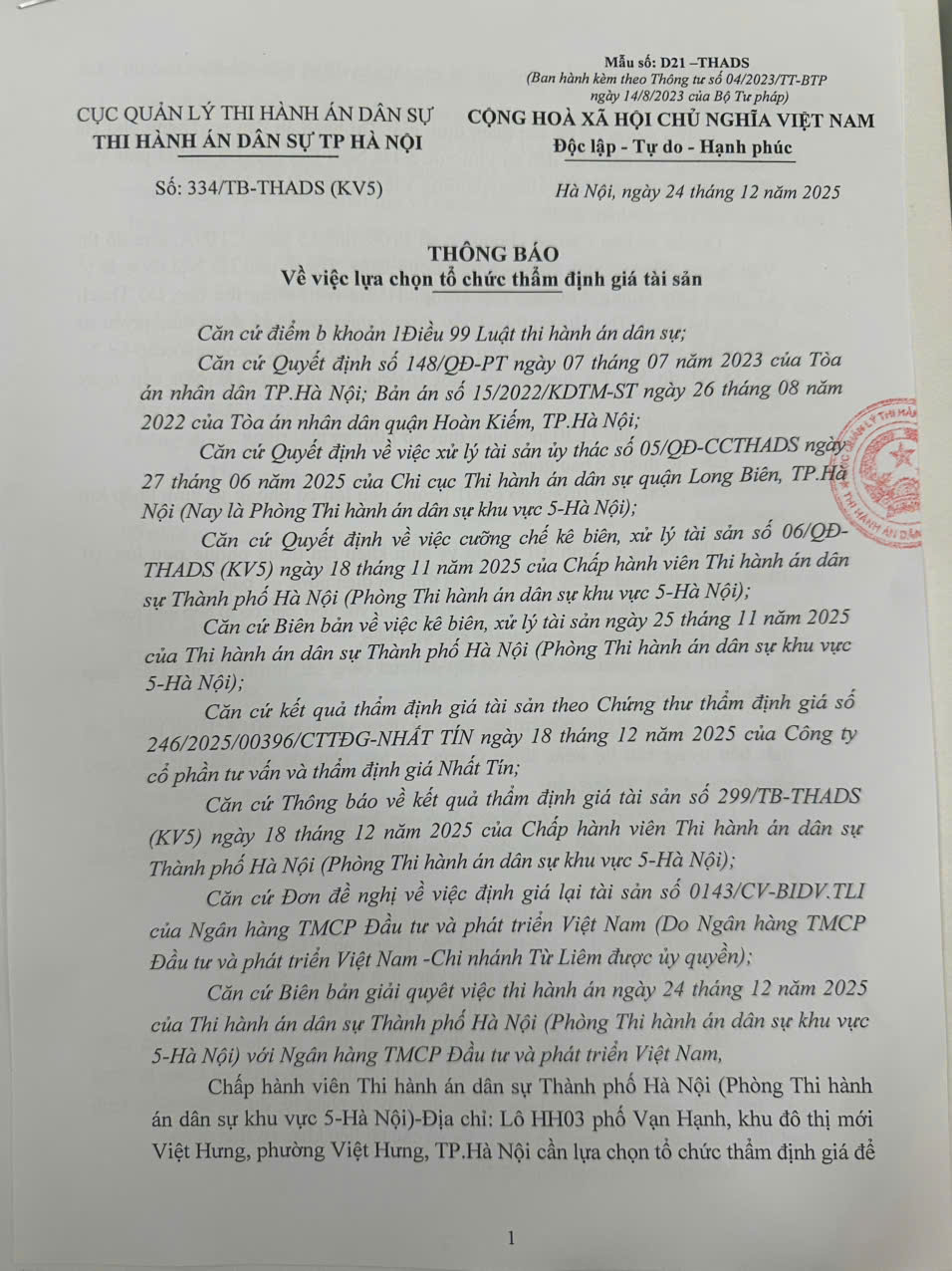 Phòng thi hành án dân sự khu vực 5 - Hà Nội thông báo lựa chọn tổ chức thẩm định giá tài sản số 334/TB-THADS ngày 24/12/2025