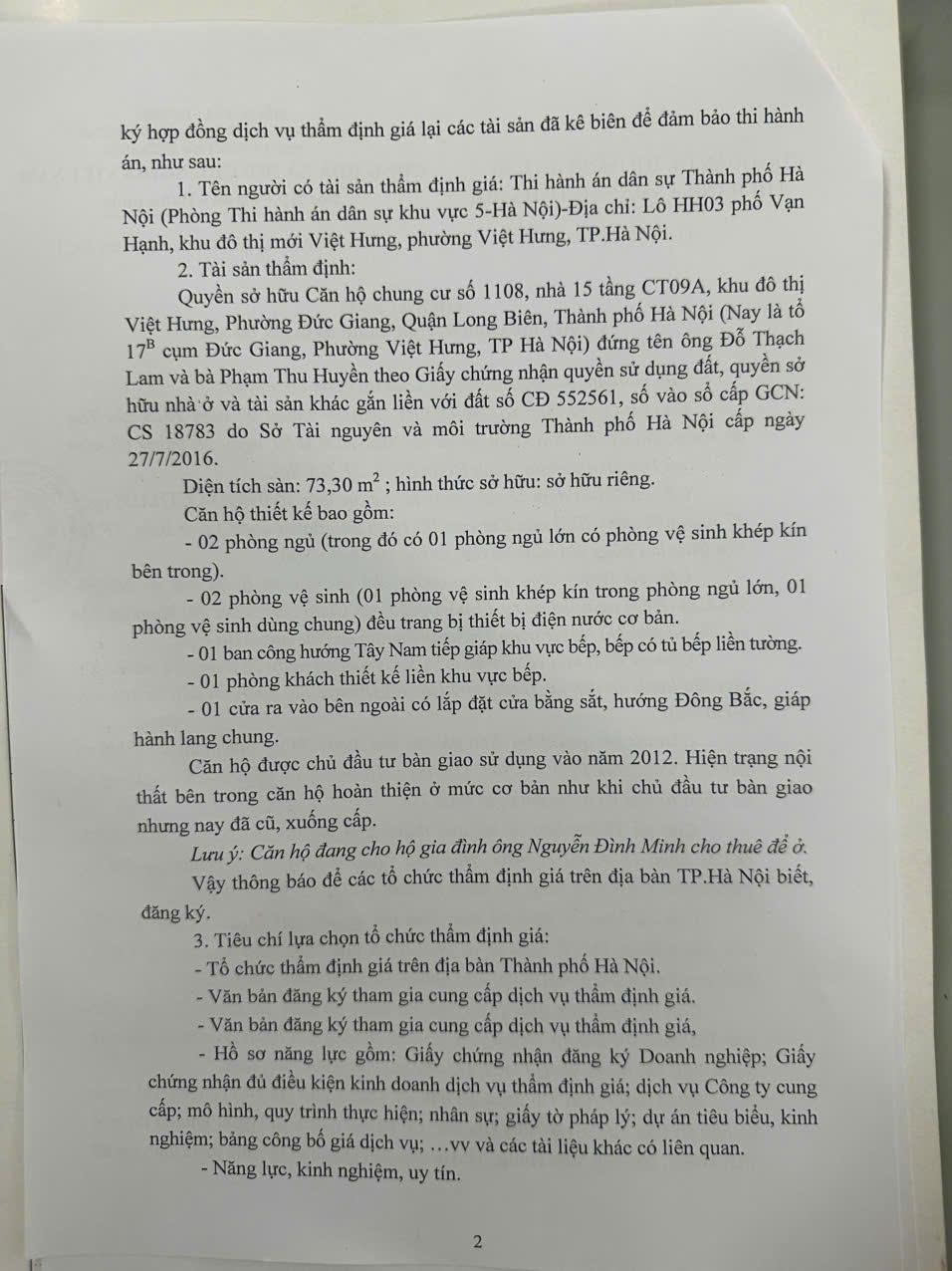 Thông báo số 773/TB-CCTHADS ngày 11/8/2021 của Chi cục THADS quận Thanh Xuân về việc lựa chọn tổ chức thẩm định giá