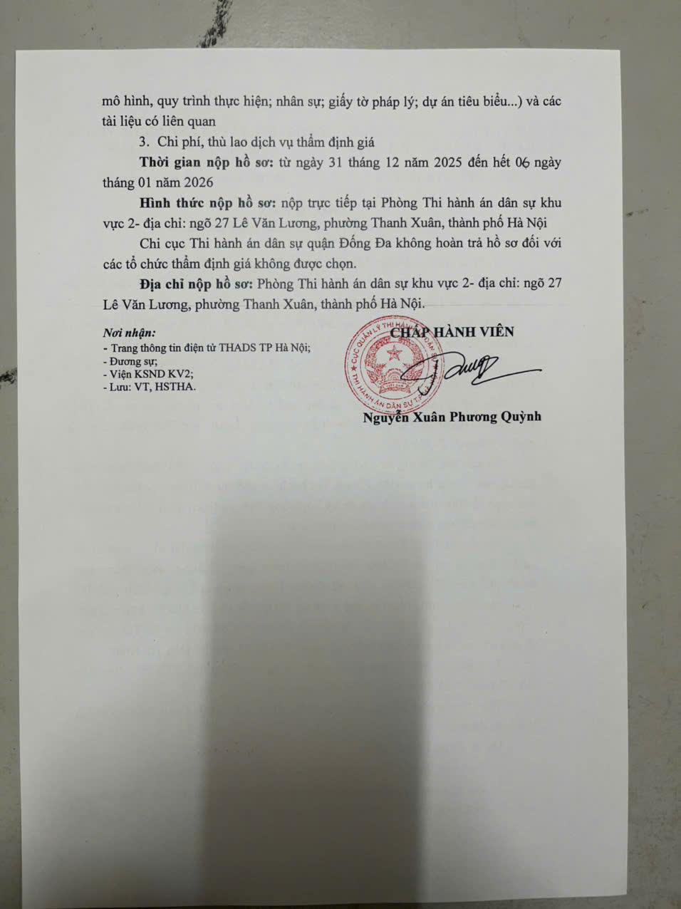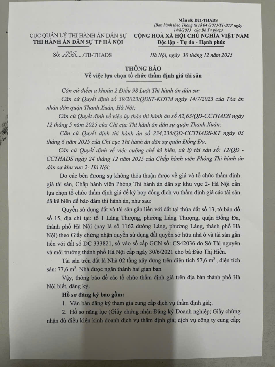 Phòng Thi hành án dân sự Khu vực 2, TP Hà Nội Thông báo về việc lựa chọn tổ chức thẩm định giá tài sản số 245/TB - THADS ngày 30/12/2025