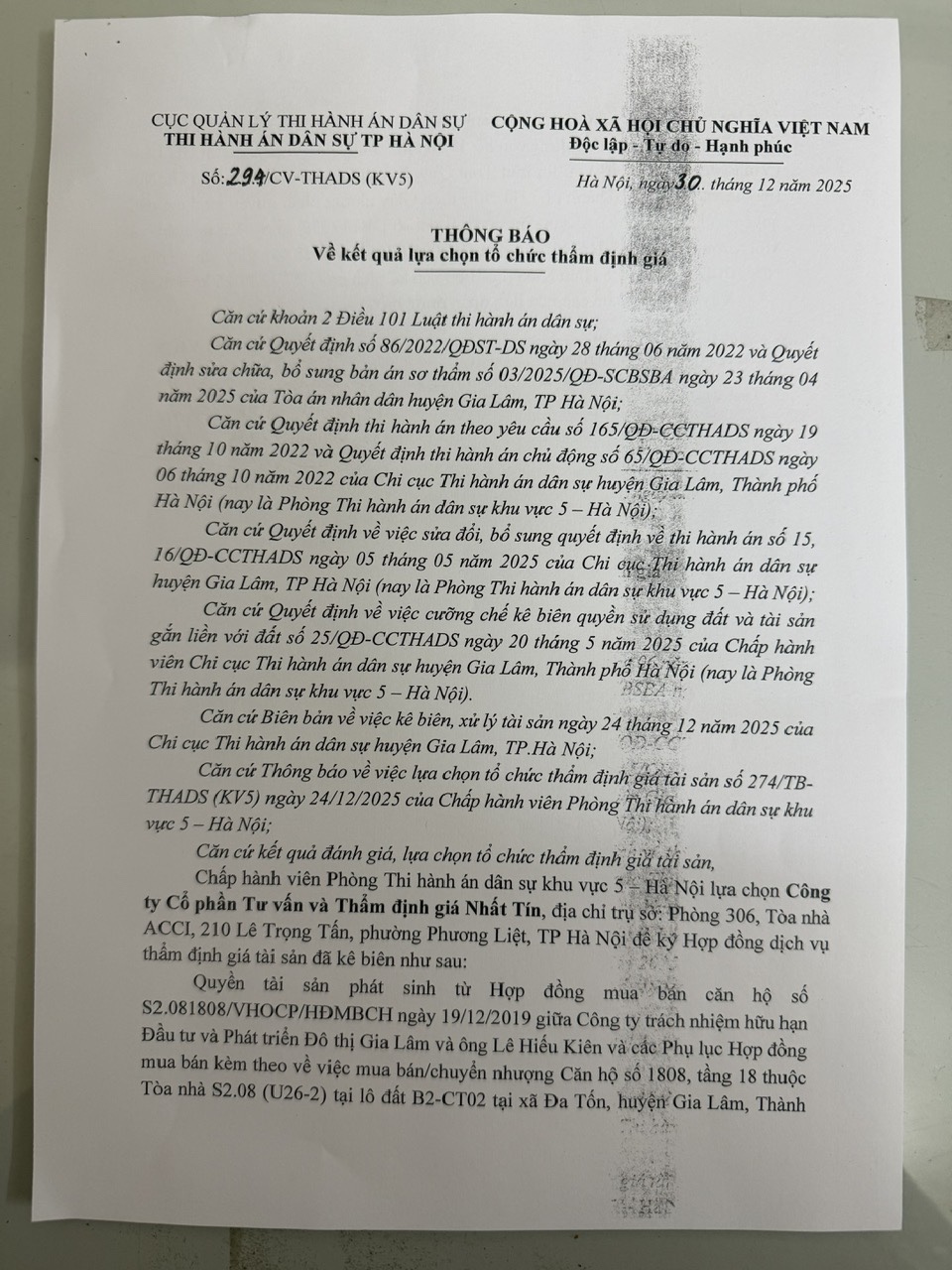 Phòng THADS KV5 Thông báo kết quả lựa chọn tổ chức thẩm định giá số 294/THADS(KV5) ngày 30/12/2025