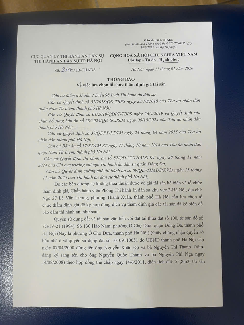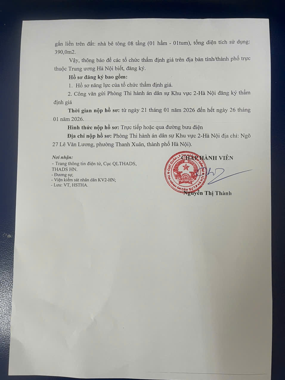 Phòng Thi hành án dân sự KHu vực 2-Hà Nội Thông báo lựa chọn tổ chức thẩm định giá số 314/TB-THADS ngày 21/01/2026
