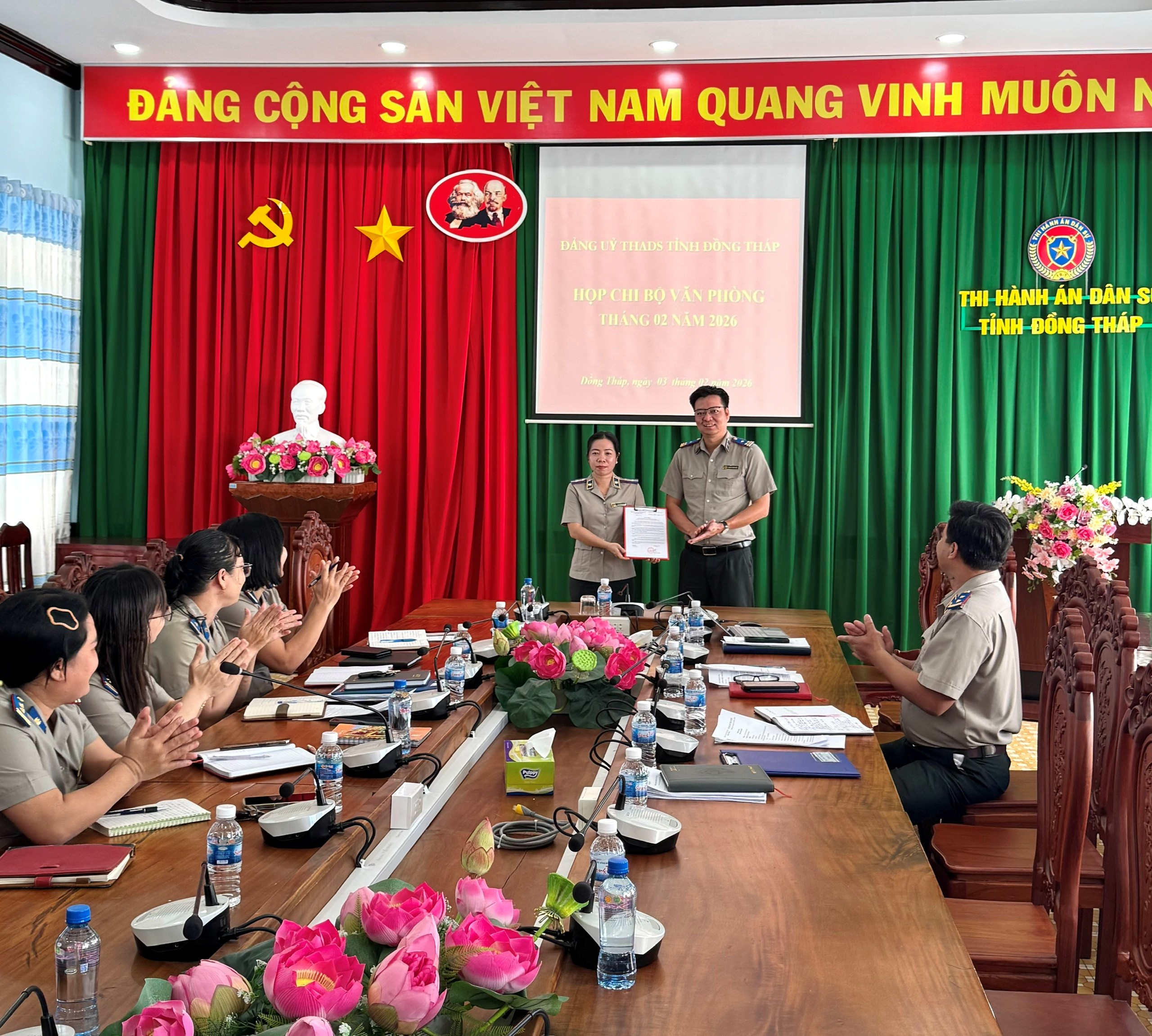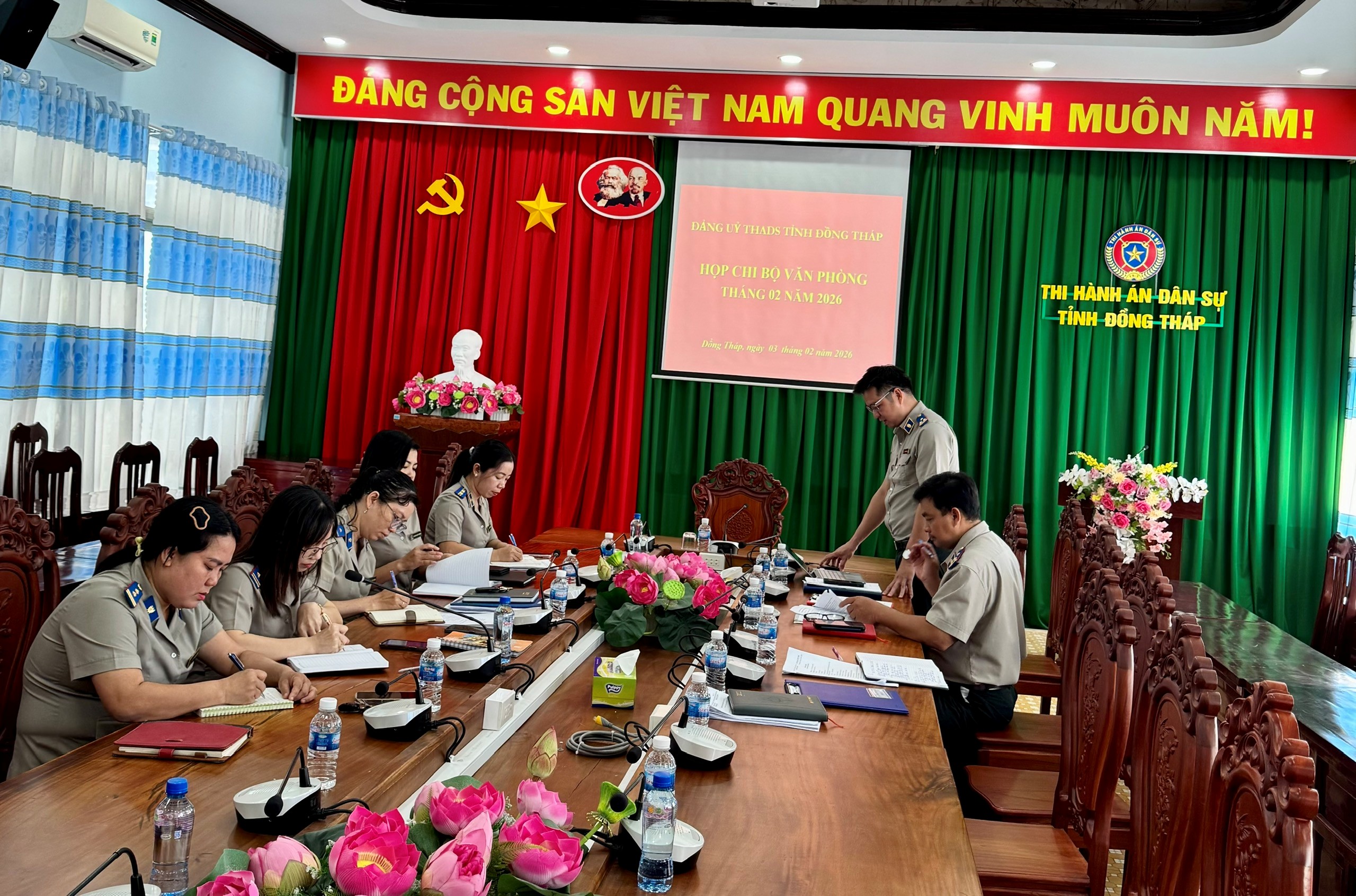 Theo lịch sinh hoạt Chi bộ, ngày 03/02/2026. Chi bộ Văn phòng Thi hành án dân sự tỉnh Đồng Tháp tổ chức sinh hoạt Chi bộ thường kỳ tại trụ sở của đơn vị. Chi ủy Văn phòng THADS tỉnh được kiện toàn theo Quyết định số 54-QĐ/ĐU ngày 31/12/2025 của Ban Chấp hành Đảng bộ Thi hành án dân sự tỉnh. Ngay sau khi được kiện toàn, việc tiếp tục đổi mới và nâng cao chất lượng sinh hoạt Chi bộ là yêu cầu cấp thiết, có ý nghĩa đặc biệt quan trọng góp phần xây dựng Đảng trong sạch, vững mạnh toàn diện, hoàn thành vai trò, sứ mệnh lãnh đạo của Đảng trong công tác thi hành án dân sự.