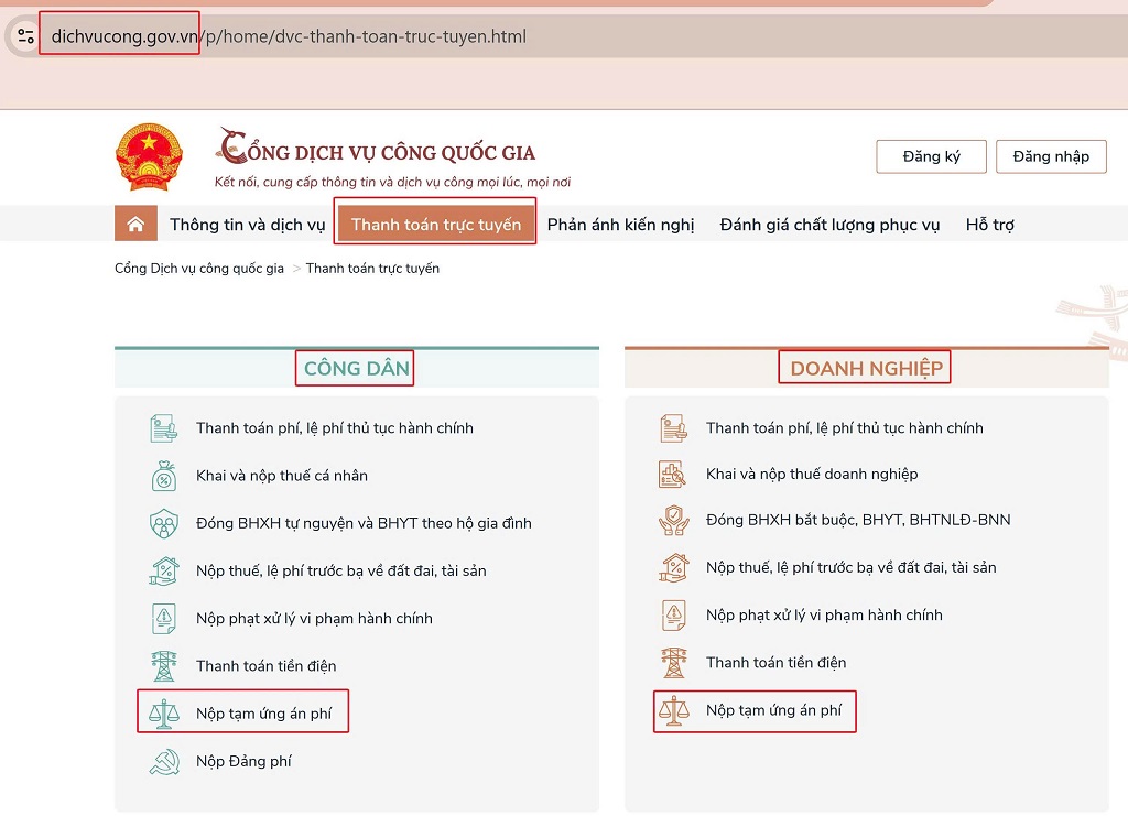 Bước 2. Công dân (người dân, doanh nghiệp) truy cập vào Cổng DVCQG và nộp tiền tạm ứng án phí tòa án bằng cách: