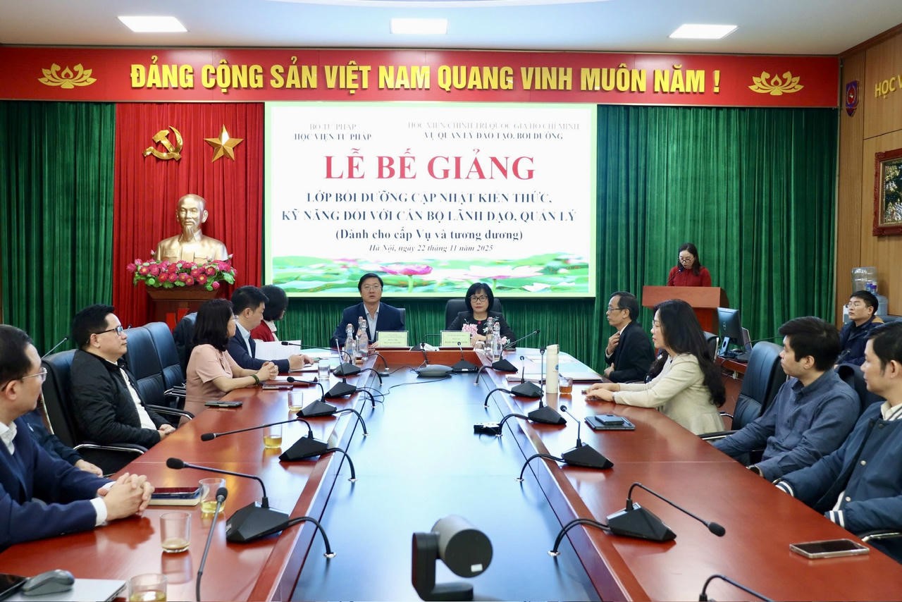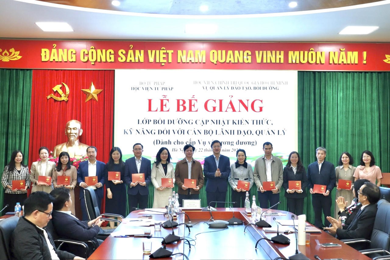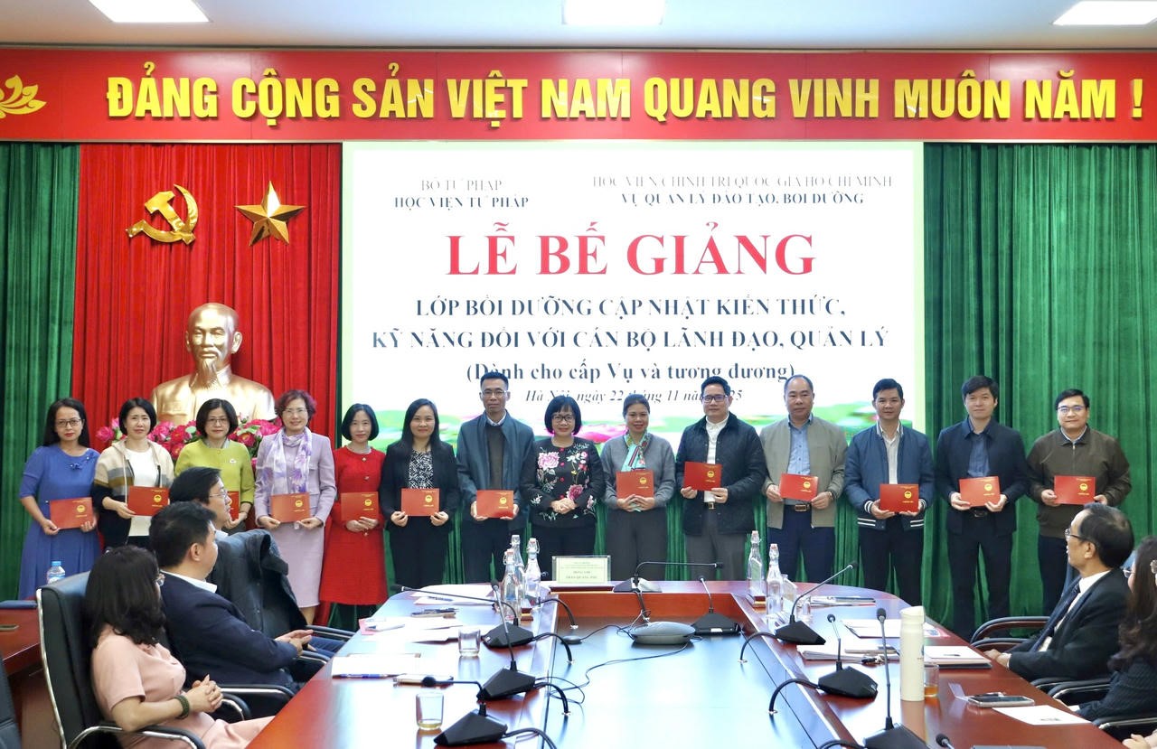 Tham gia khoá học có 52 học viên là viên chức giữ chức vụ lãnh đạo, quản lý cấp Vụ và tương đương các đơn vị thuộc Bộ Tư pháp. Lớp học thực hiện theo Chương trình bồi dưỡng cập nhật kiến thức, kỹ năng đối với cán bộ lãnh đạo, quản lý cấp Vụ và tương đương theo Kế hoạch số 1123-KH/HVCTQG ngày 15 tháng 10 năm 2025 của Học viện Chính trị quốc gia Hồ Chí Minh.