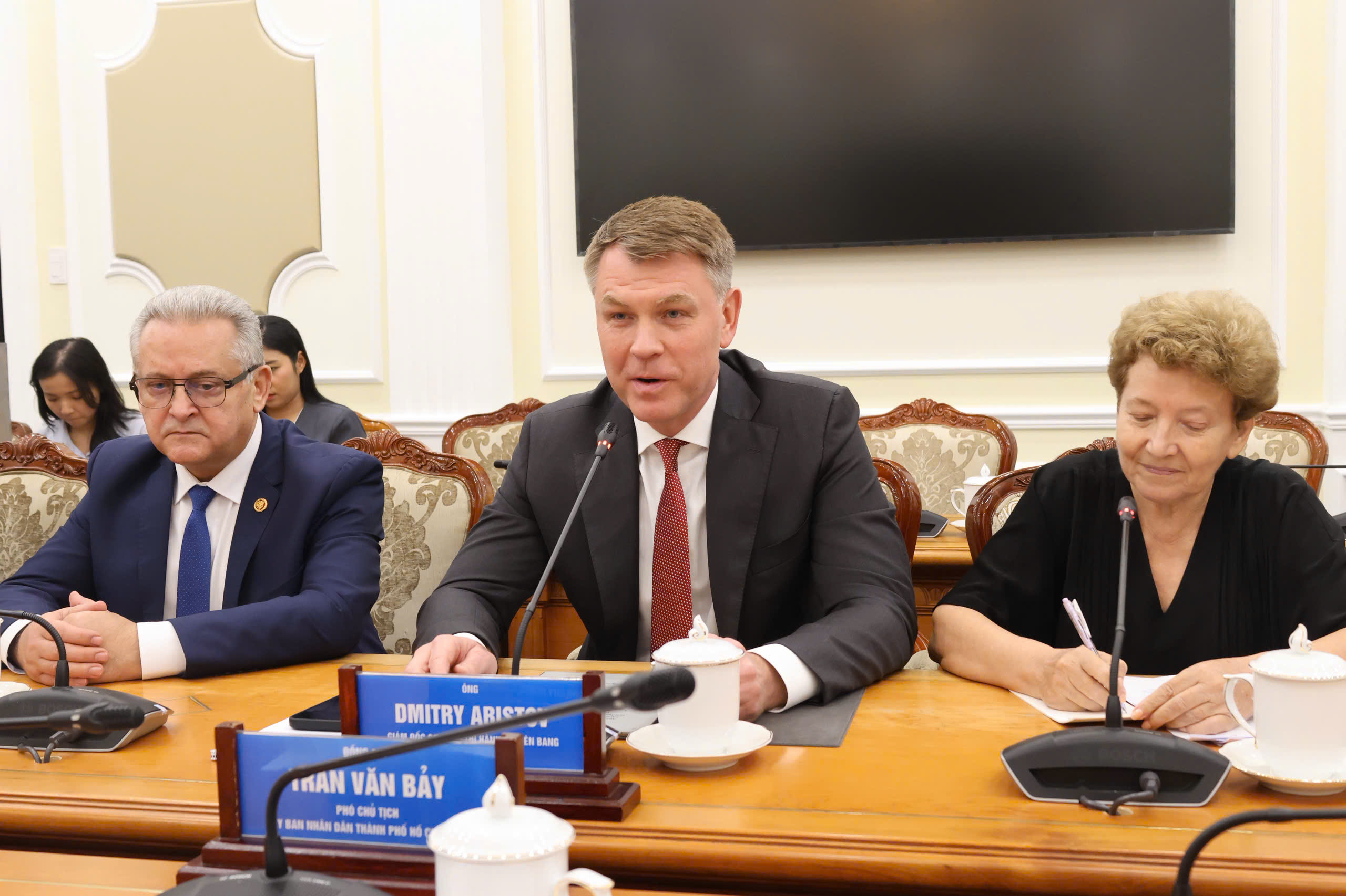 Chiều 4/12, Phó Chủ tịch UBND TP.HCM Trần Văn Bảy đã tiếp ông Dmitry Aristov và đoàn công tác. Tại buổi tiếp, Phó Chủ tịch UBND TP.Hồ Chí Minh Trần Văn Bảy nhấn mạnh, thời gian qua, quan hệ Đối tác chiến lược toàn diện Việt Nam - Liên bang Nga tiếp tục được tăng cường và phát triển, trao đổi đoàn và tiếp xúc các cấp được duy trì thường xuyên, tiêu biểu nhất là chuyến thăm Liên bang Nga của Tổng Bí thư Tô Lâm vào tháng 5/2025. Chuyến thăm đã diễn ra vào thời điểm hai nước vừa kỷ niệm 75 năm Ngày thiết lập quan hệ ngoại giao, cũng như đúng vào dịp kỷ niệm 70 năm Chủ tịch Hồ Chí Minh lần đầu tiên thăm chính thức Liên Xô trước đây và Liên bang Nga ngày nay. Trong khuôn khổ chuyến thăm, hai bên đã thông qua Tuyên bố chung về các định hướng chính trong quan hệ Đối tác chiến lược toàn diện Việt Nam - Nga trong giai đoạn mới. Những thành tựu của 75 năm hợp tác Việt Nam - Nga là nền tảng vững chắc và là động lực để hai bên củng cố, mở rộng và đưa quan hệ Đối tác chiến lược toàn diện đi vào chiều sâu, thực chất và hiệu quả, là hình mẫu hợp tác trong giai đoạn mới.