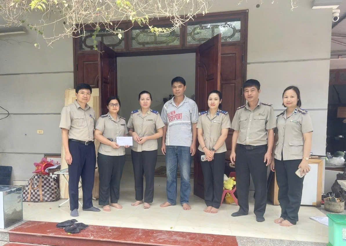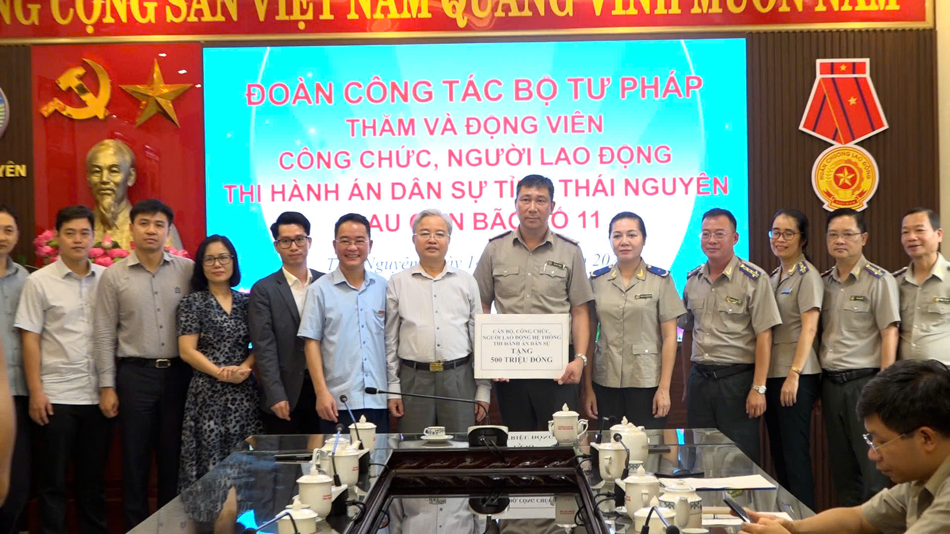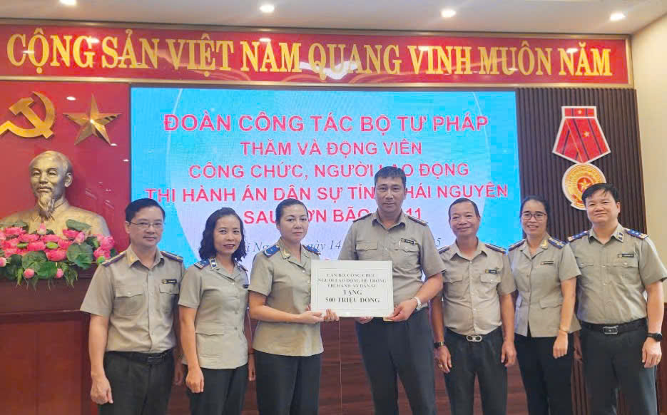 Phó Cục trưởng cũng thay mặt Lãnh đạo Cục Quản lý Thi hành án dân sự và Hệ thống THADS trao số tiền hỗ trợ 500 triệu đồng cho công chức, người lao động THADS tỉnh Thái Nguyên bị ảnh hưởng bởi hoàn lưu bão số 11.