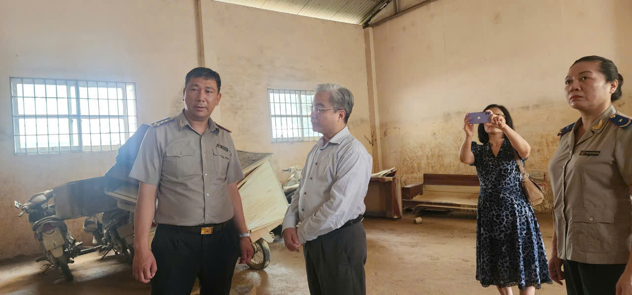 Đồng chí Nguyễn Quang Thái, Phó Bí thư chuyên trách Đảng ủy Bộ Tư pháp và Phó Cục trưởng Cục Quản lý THADS Trần Thị Phương Hoa kiểm tra thiệt hại kho vật chứng THADS tỉnh Thái Nguyên.