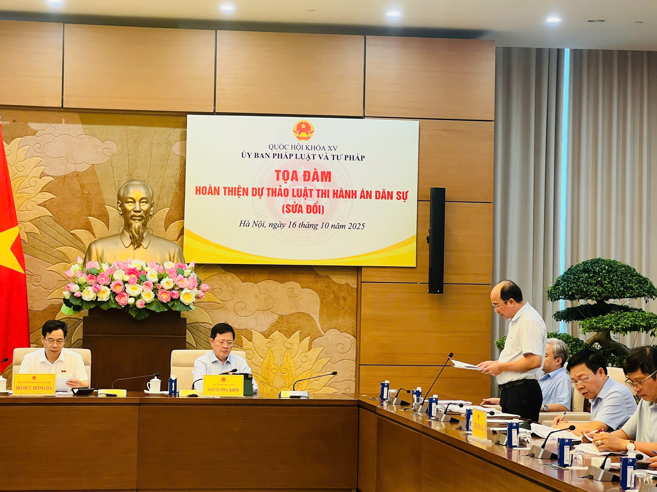 Thực hiện Kế hoạch số 1088/KH-UBPLTP15 ngày 30/9/2025 của Ủy ban Pháp luật và Tư pháp của Quốc hội, để phục vụ việc nghiên cứu, tiếp thu, chỉnh lý, hoàn thiện Dự thảo Luật Thi hành án dân sự (sửa đổi) trình Quốc hội xem xét, thông qua tại Kỳ họp thứ 10 (tháng 10/2025), chiều ngày 16/10/2025, Thường trực Ủy ban Pháp luật và Tư pháp của Quốc hội đã tổ chức Tọa đàm: “Hoàn thiện dự thảo Luật Thi hành án dân sự (sửa đổi).