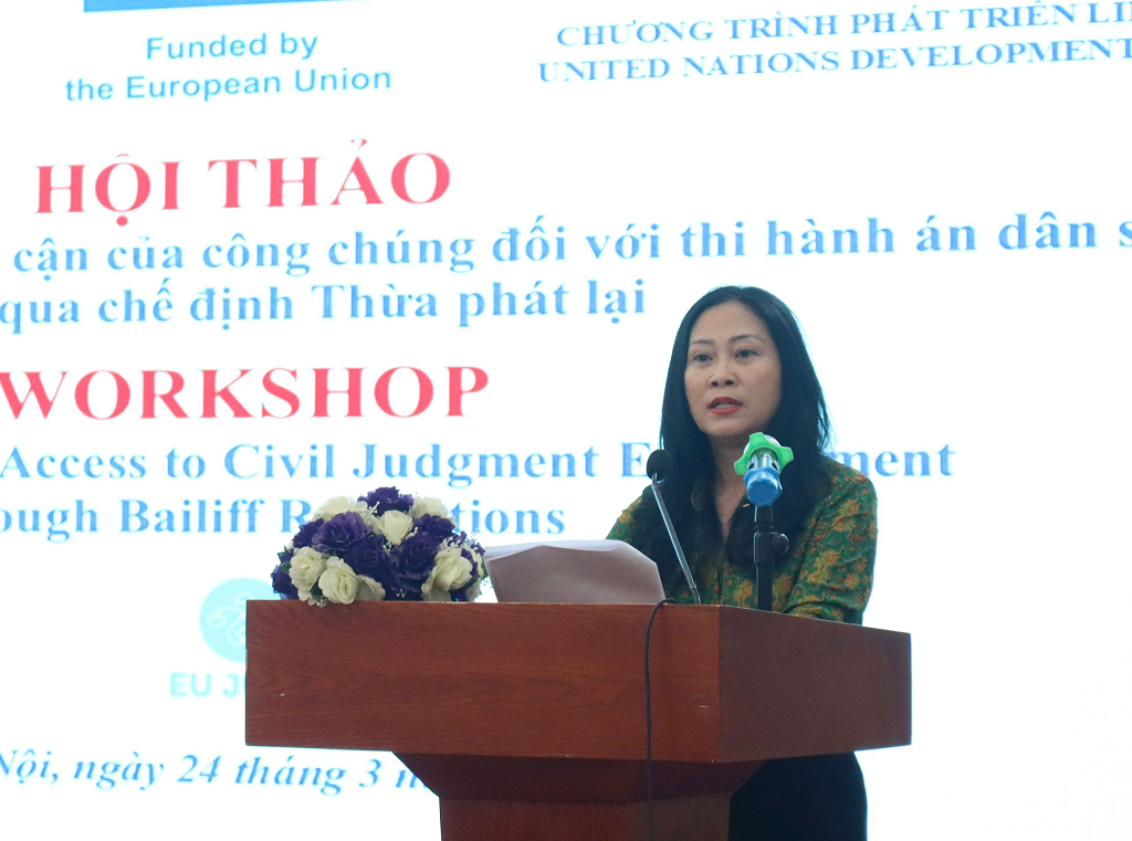 Tại Hội thảo, bà Nguyễn Thị Thanh Hải, Cố vấn trưởng Dự án EU JULE II, UNDP Việt Nam cho biết một trong những mục tiêu quan trọng của Dự án EU JULE giai đoạn II là nâng cao khả năng tiếp cận công lý thông qua việc xây dựng hệ thống pháp luật và tư pháp ngày càng hoàn thiện, đồng bộ, minh bạch và toàn diện. Trong đó, Chương trình đặc biệt chú trọng hỗ trợ thực hiện xã hội hóa các dịch vụ công, nhất là các dịch vụ công trong lĩnh vực tư pháp, nhằm tăng cường khả năng tiếp cận các dịch vụ này cho người dân.
