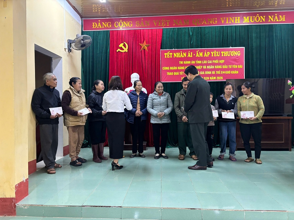 Đoàn đã thăm và tặng 60 xuất quà trị giá mỗi suất quà là 500.000 đồng; tổng trị giá các xuất quà là 30.000.000 đồng để trao tặng cho các hộ nghèo có hoàn cảnh đặc biệt khó khăn của Tổ dân phố Ngòi Sen trong dịp Tết Nguyên đán Bính Ngọ. Những món quà tuy nhỏ về vật chất nhưng đó là hoạt động thiết thực, ý nghĩa, ý thức trách nhiệm đối với các gia đình có hoàn cảnh khó khăn, với cộng đồng và xã hội của tập thể cán bộ, công chức Thi hành án dân sự tỉnh Lào Cai, Ngân hàng Nông nghiệp, Ngân hàng Đầu tư và phát triển Việt Nam, Chi nhánh Yên Bái gửi tới bà con để đón xuân Bính Ngọ 2026 thật ấm áp, vui tươi.