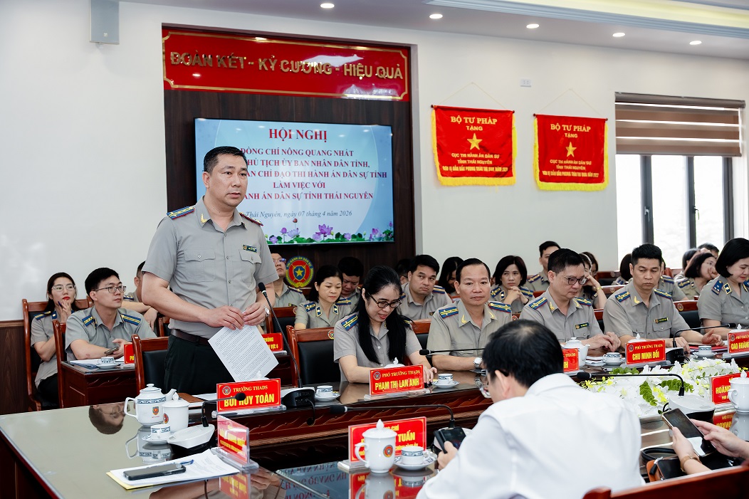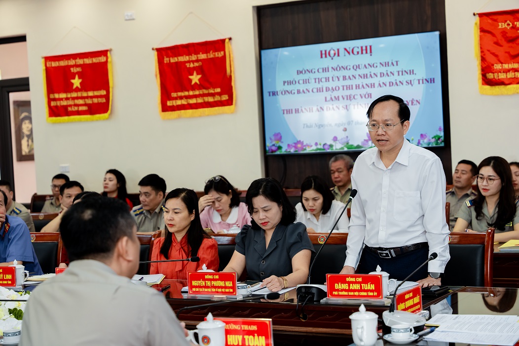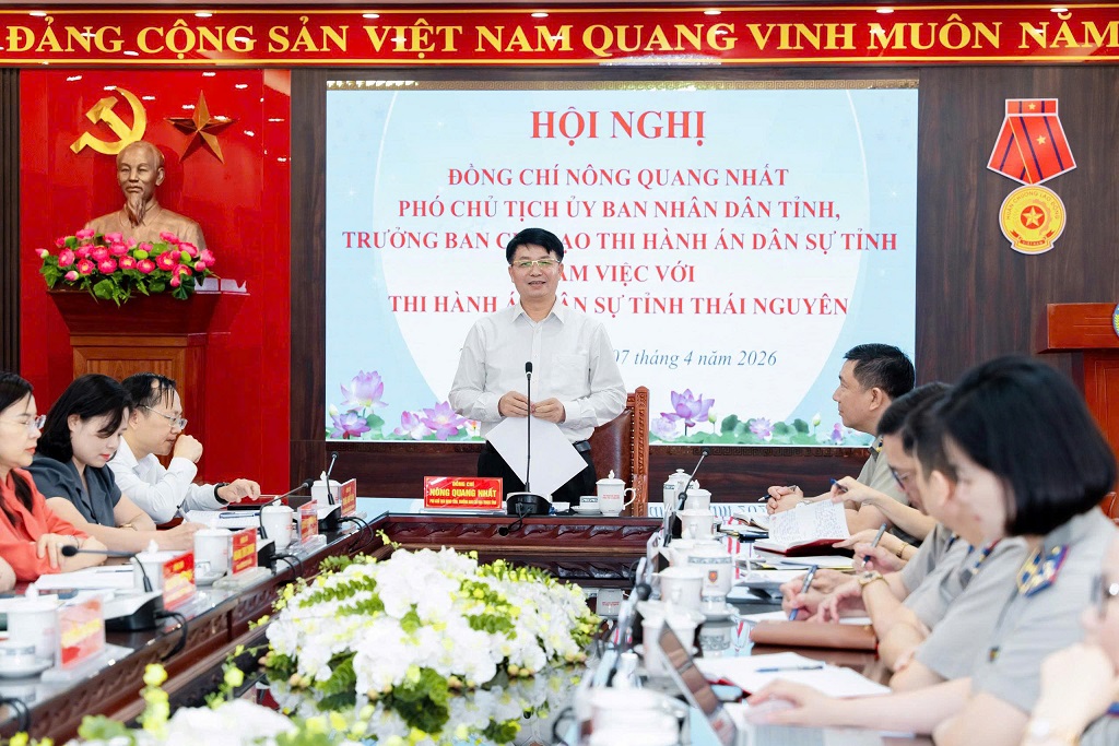 Sáng ngày 07/4/2026, tại Thi hành án dân sự tỉnh Thái Nguyên, đồng chí Nông Quang Nhất – Phó Chủ tịch UBND tỉnh, Trưởng Ban Chỉ đạo Thi hành án dân sự tỉnh đã chủ trì buổi làm việc với Thi hành án dân sự tỉnh Thái Nguyên về công tác thi hành án dân sự (THADS) và theo dõi thi hành án hành chính (THAHC) trên địa bàn.