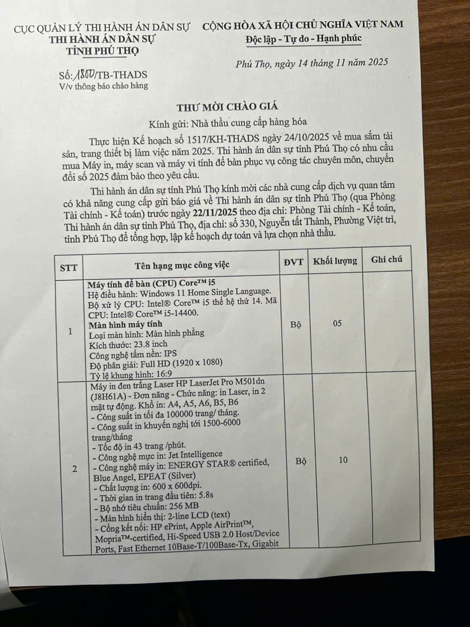 Thông báo Chào hàng số 1800