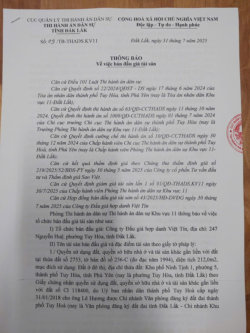 Phòng Thi hành án dân sự khu vực 11, tỉnh Đắk Lắk thông báo số 09/TB-THADS.KV11 ngày 31/7/2025 về việc bán đấu giá tài sản