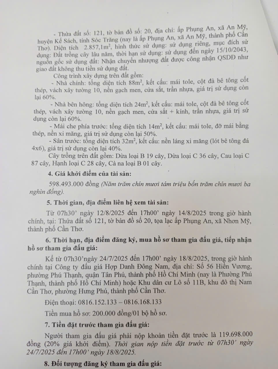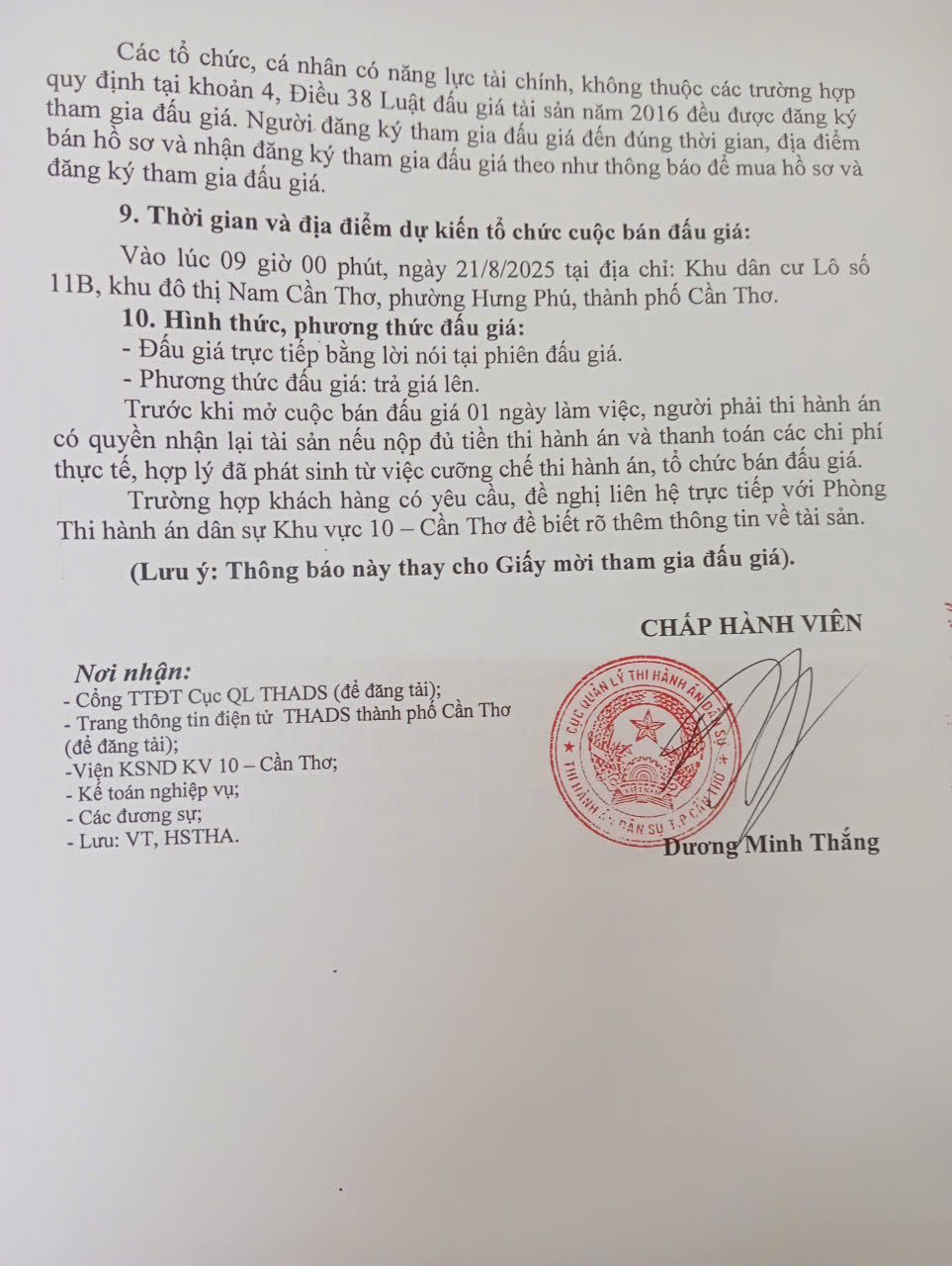 Thi hành án dân sự thành phố Cần Thơ - Phòng THADS Khu vực 10 Thông báo bán đấu giá tài sản số 10/TB-THADS.KV10 ngày 01/8/2025