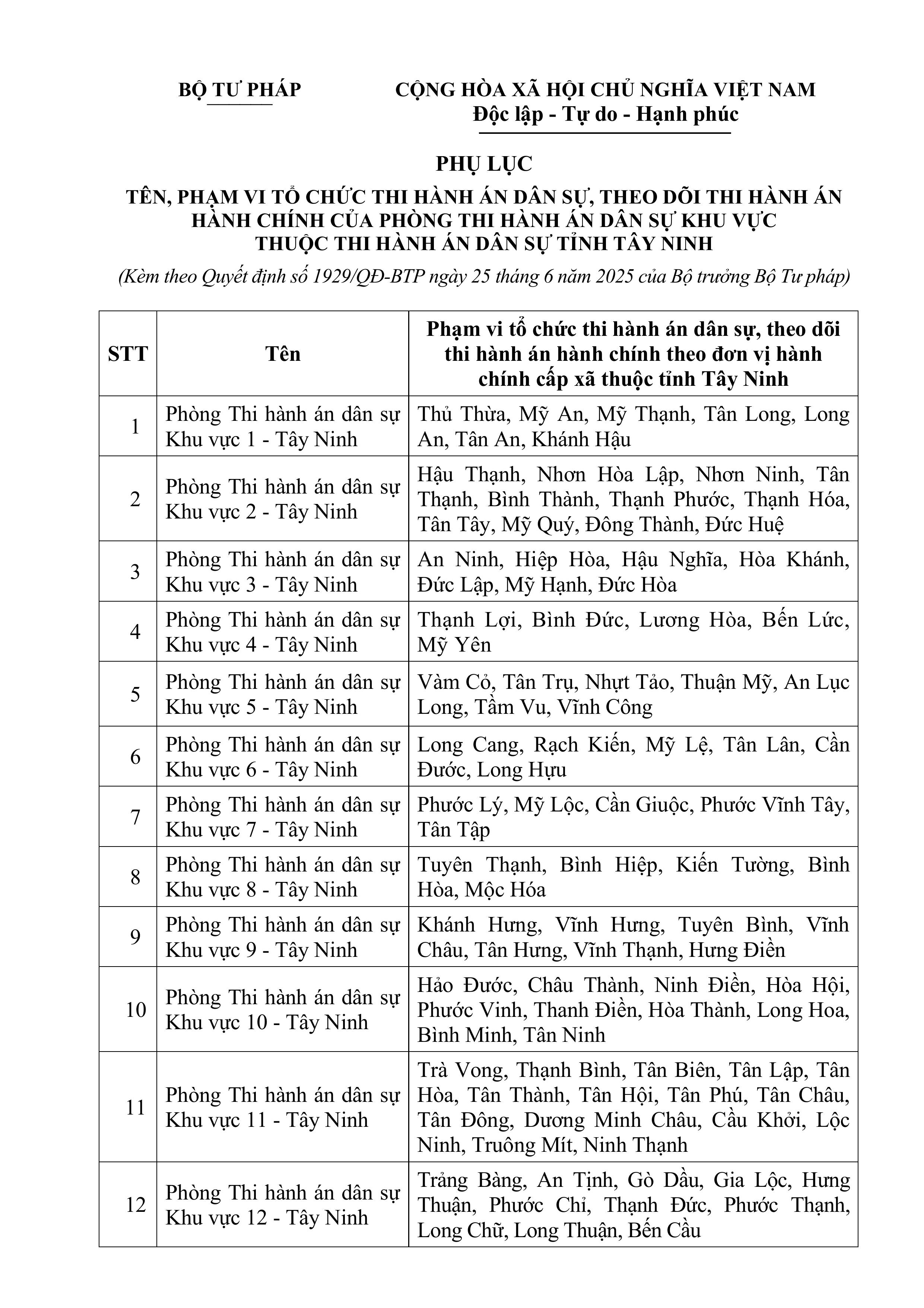 THÔNG BÁO về việc công khai Quyết định số 1929/QĐ-BTP ngày 25/6/2025 của Bộ trưởng Bộ Tư pháp về việc thành lập Thi hành án dân sự tỉnh Tây Ninh