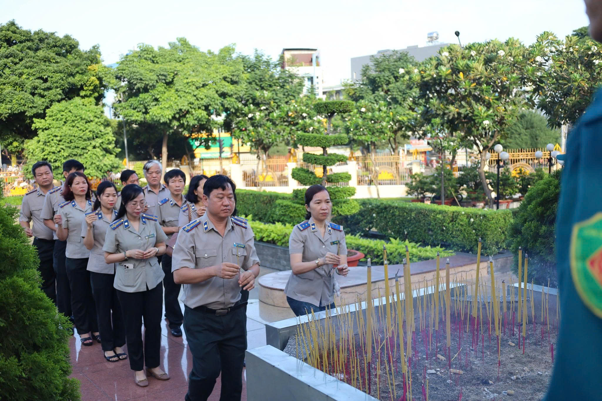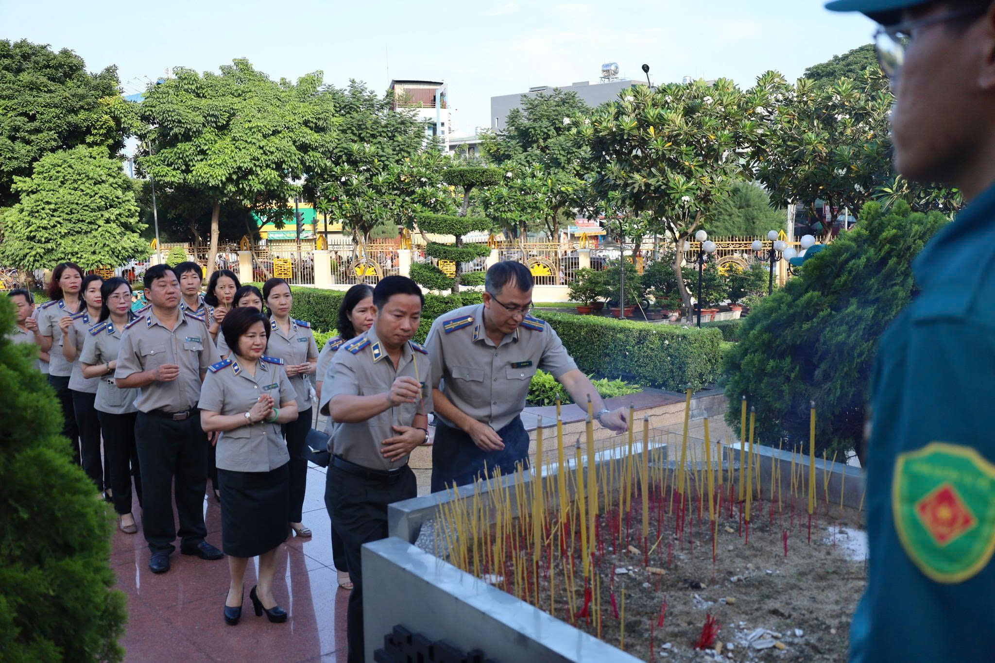 Kết thúc buổi lễ, các đại biểu đã đến thăm và dâng hương tại khu vực đặt bia tưởng niệm liệt sĩ, thăm hỏi thân mật lực lượng trực bảo vệ Đài Liệt sĩ, thể hiện sự quan tâm và sự tri ân của ngành đối với những người đang tiếp tục gìn giữ không gian linh thiêng của Thành phố.