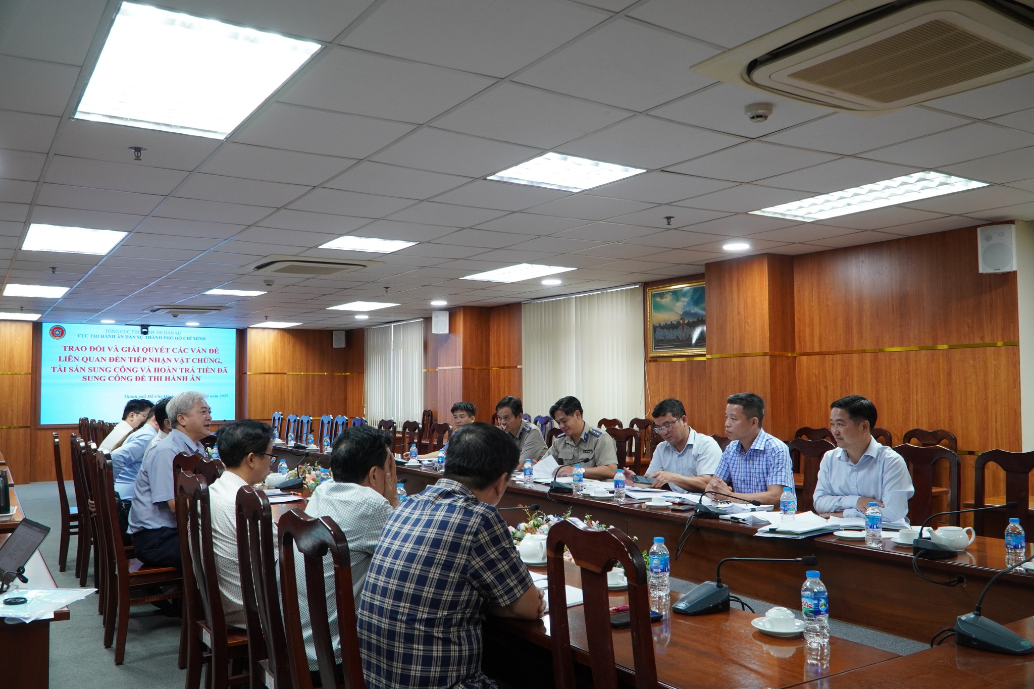 Cuộc họp được tổ chức trong bối cảnh thực tiễn thi hành án dân sự tại TP. Hồ Chí Minh đang xuất hiện một số tình huống phát sinh liên quan đến việc xử lý vật chứng, tài sản sau khi bản án có hiệu lực pháp luật tuyên sung công hoặc tuyên hoàn trả tiền đã sung công cho đương sự. Một số trường hợp chưa có sự thống nhất về trách nhiệm, quy trình phối hợp giữa các cơ quan trong việc tiếp nhận, xử lý, hoặc hoàn trả số tiền đã được nộp vào ngân sách Nhà nước, gây khó khăn cho quá trình thi hành án và ảnh hưởng đến quyền, lợi ích hợp pháp của người được thi hành án.