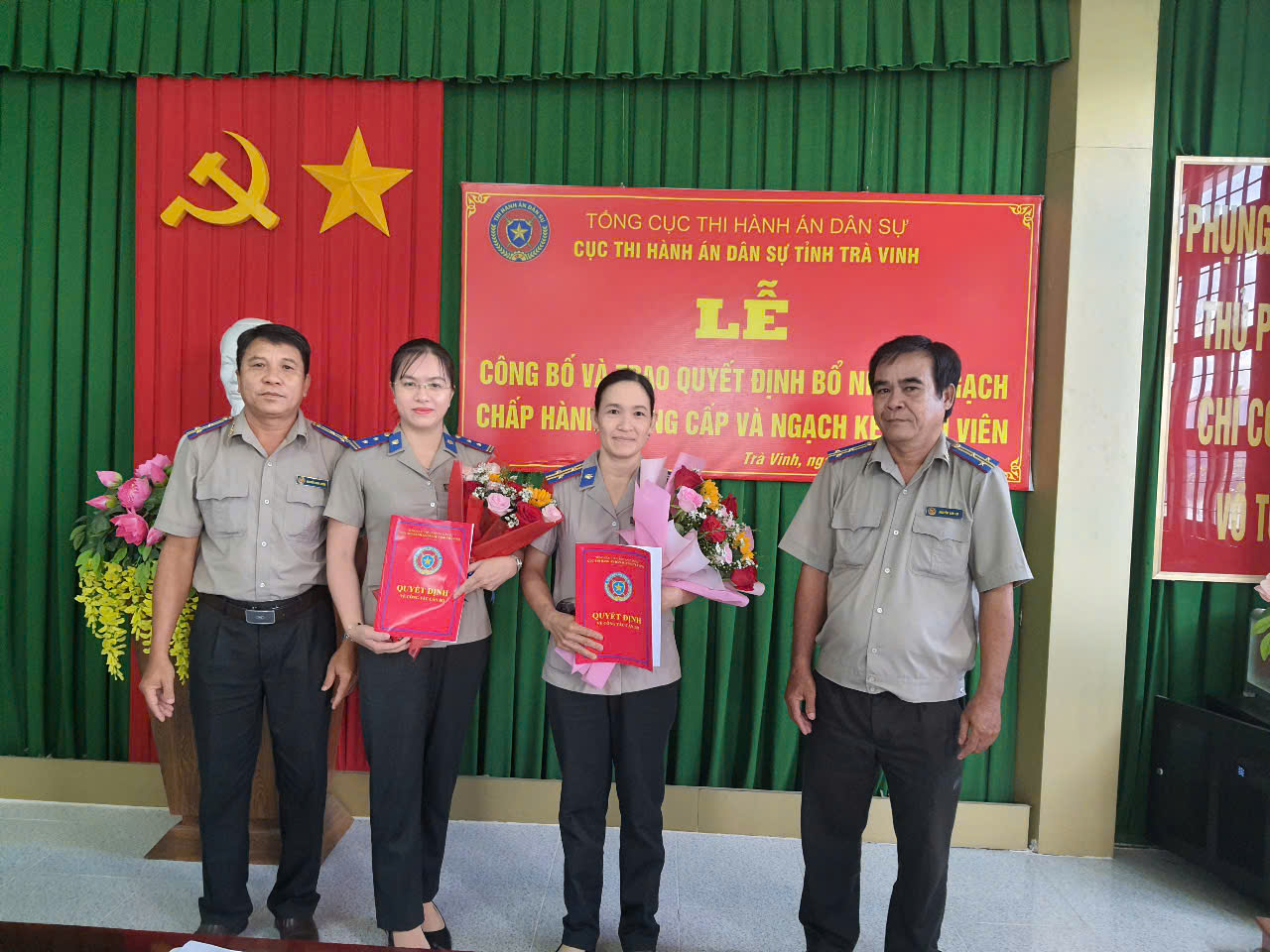 Tại buổi lễ đồng chí Lâm Thị Bé Ba – Chánh Văn phòng Cục THADS tỉnh thừa ủy quyền của Lãnh đạo Cục công bố Quyết định bổ nhiệm của Bộ trưởng Bộ Tư pháp cho đồng chí Hà Thị Thanh Loan, Chấp hành viên Trung cấp Chi cục THADS huyện Cầu Kè và Quyết định của Cục trưởng Cục THADS tỉnh Trà Vinh cho đồng chí Lý Thị Thu Xuân, Kế toán viên Chi cục THADS thành phố Trà Vinh.