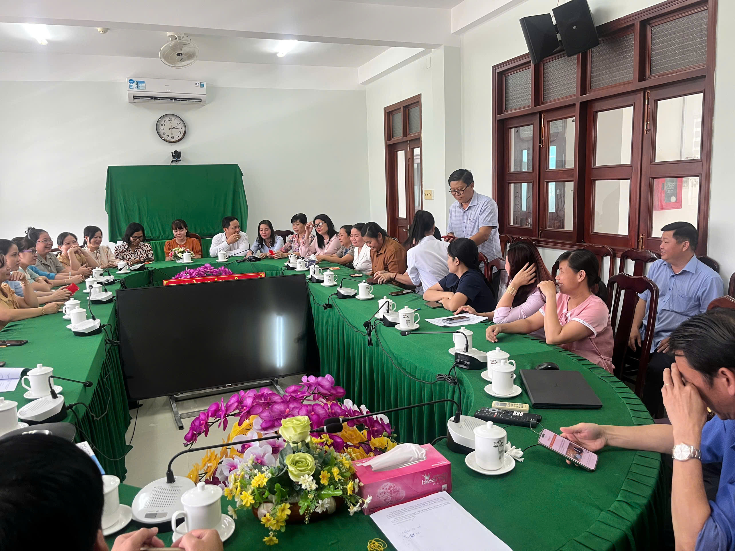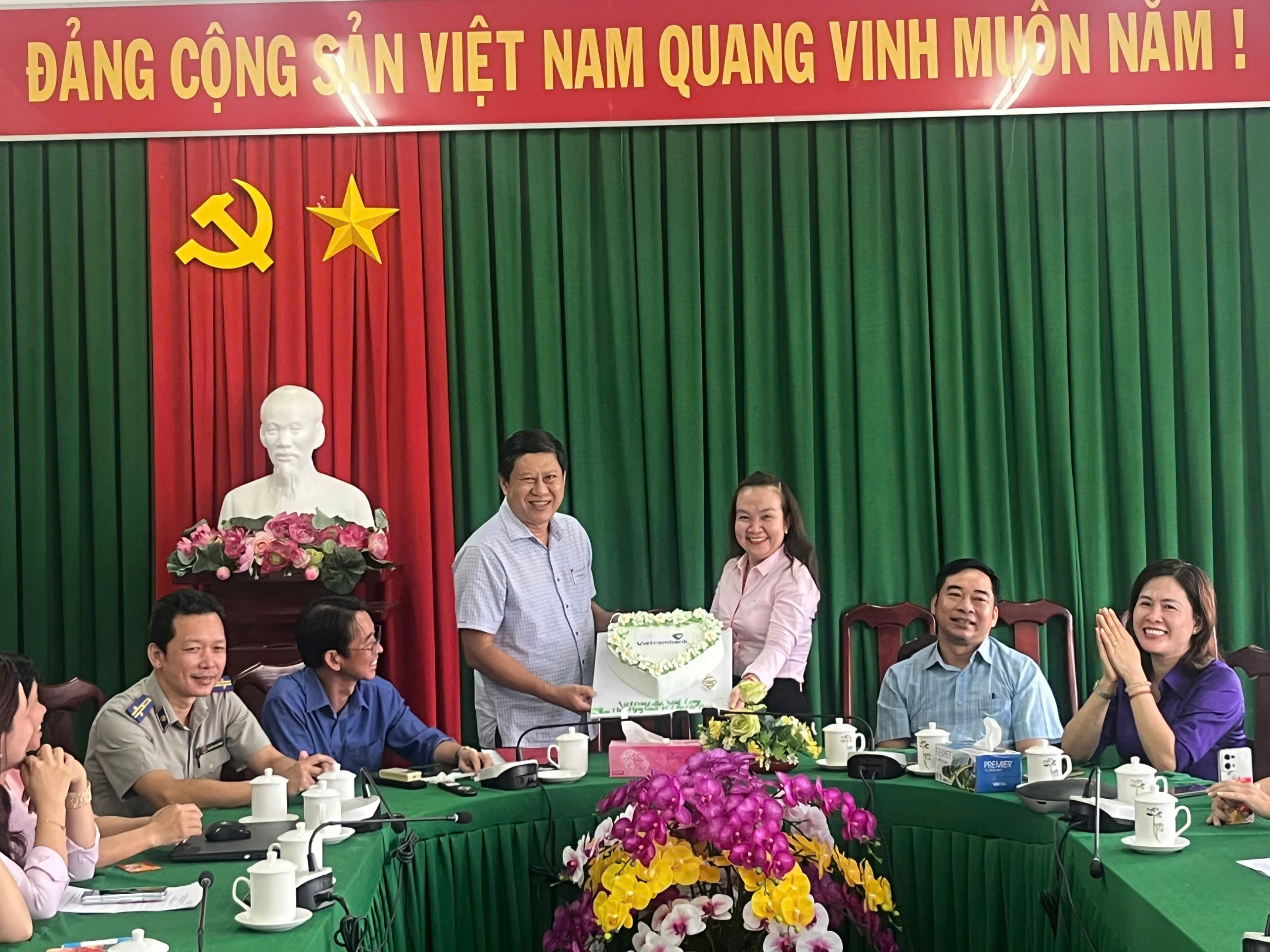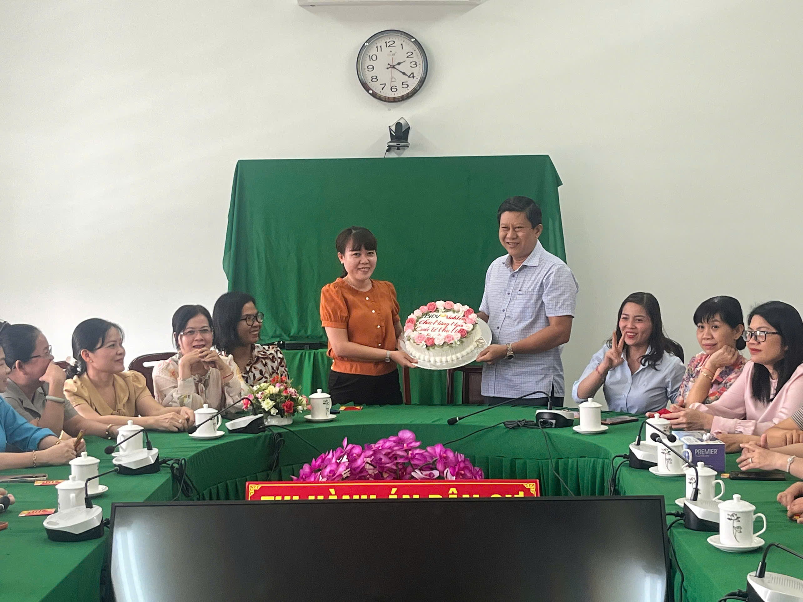 Buổi gặp mặt diễn ra trong không khí ấm áp, thân mật với hoạt động giao lưu, chúc mừng và cùng nhau thưởng thức bánh kem, tạo sự gắn kết trong tập thể cơ quan.