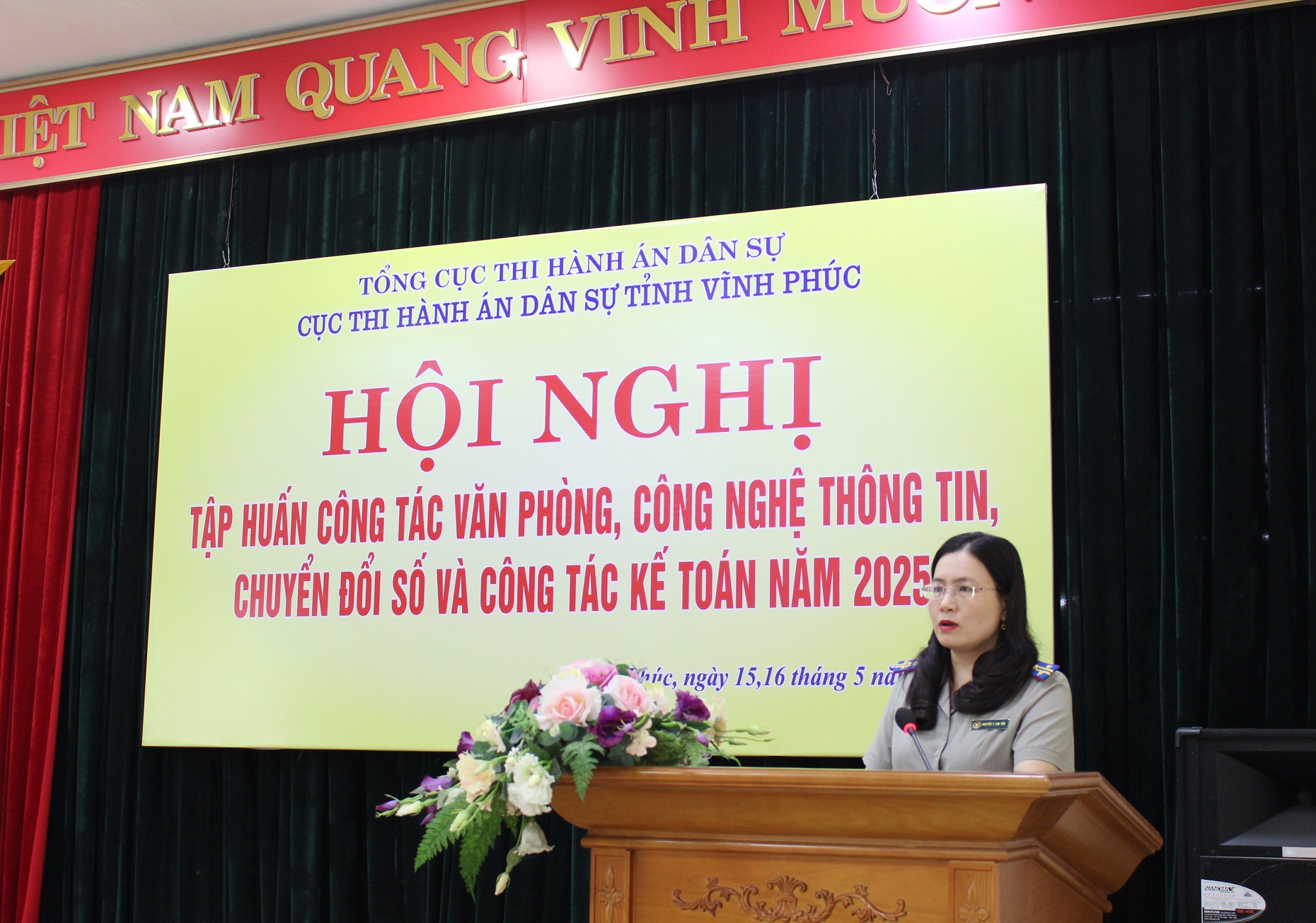 Ngày 15-16/5/2025, Cục Thi hành án dân sự Vĩnh Phúc tổ chức Hội nghị tập huấn công tác văn phòng, công nghệ thông tin, chuyển đổi số và công tác kế toán, Cục THADS Vĩnh Phúc đã mời các đồng chí Nguyễn Thị Thu Hương, Nguyễn Thị Hồng Tuyết – Vụ Kế hoạch tài chính, Tổng cục Thi hành án dân sự và các đồng chí có nhiều kinh nghiệm thực tiễn trong công tác Văn phòng, ứng dụng Công nghệ thông tin, chuyển đổi số của Cục Thi hành án dân sự Vĩnh Phúc là Báo cáo viên về truyền đạt nội dung cho Hội nghị tập huấn.